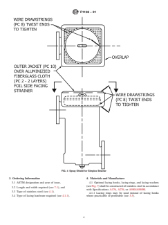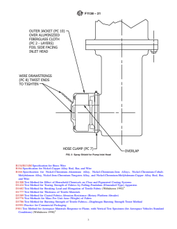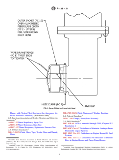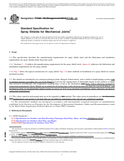 ABSTRACT This specification describes the manufacturing requirements for spray shield stock and the fabrication and installation requirements for spray shields made from that stock. The physical and mechanical properties for the aluminized glass cloth, thread, and protective outer jacket shall be as specified. If lacing hooks or rings are of the type that fastens by stitching, the hooks or rings shall be attached to the backup washers using a wire stitch machine and wire. The methods for testing the aluminized glass cloth, thread, and protective outer jacket shall be as specified. SCOPE 1.1 This specification describes the manufacturing requirements for spray shield stock and the fabrication and installation requirements for spray shields made from that stock. 1.1.1 Sections 2 – 14 address the manufacturing requirements for the spray shield stock. Annex A1 addresses the fabrication and installation requirements for the spray shields. 1.1.2 Fig. 1 shows the typical construction of a spray shield. Figs. 2-6 show methods of installation of a spray shield on various mechanical joints. FIG. 1 Spray Shield Construction (Typical) FIG. 2 Installation of Butterfly Valve Shield FIG. 3 Spray Shield for Pump Inlet Head FIG. 4 Spray Shield for Simplex Strainer FIG. 5 Spray Shield for Butterfly Valve FIG. 6 Spray Shield for Valve Bonnet 1.2 The shields are intended for use around mechanical joints (flanged, bolted unions, and so forth) in liquid piping systems with an internal pressure exceeding 26.1 psi (0.18 N/mm2) to prevent the impingement of flammable liquid on hot surfaces or fluids onto electrical switchboards and components resulting from a leak in the mechanical joint, unless otherwise invoked by contractual requirements. Spray Shields are excluded on all suction lines with a head pressure less than 26.1 psi (0.18 N/mm2) and mechanical joints in non-flammable liquid systems in excess of 10 ft of an electrical switchboard, unless otherwise invoked by contractual requirements.2 1.3 The values stated in inch-pound units are to be regarded as standard. The values given in parentheses are mathematical conversions to SI units that are provided for information only and are not considered standard. 1.4 This international standard was developed in accordance with internationally recognized principles on standardization established in the Decision on Principles for the Development of International Standards, Guides and Recommendations issued by the World Trade Organization Technical Barriers to Trade (TBT) Committee.