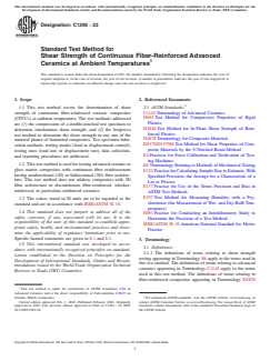 ASTM C1292-22 is a standard published by ASTM International. Its full title is "Standard Test Method for Shear Strength of Continuous Fiber-Reinforced Advanced Ceramics at Ambient Temperatures". This standard covers: SIGNIFICANCE AND USE 5.1 Continuous fiber-reinforced ceramic composites can be candidate materials for structural applications requiring high degrees of wear and corrosion resistance, and damage tolerance at high temperatures. 5.2 Shear tests provide information on the strength and deformation of materials under shear stresses. 5.3 This test method may be used for material development, material comparison, quality assurance, characterization, and design data generation. 5.4 For quality control purposes, results derived from standardized shear test specimens may be considered indicative of the response of the material from which they were taken for given primary processing conditions and post-processing heat treatments. SCOPE 1.1 This test method covers the determination of shear strength of continuous fiber-reinforced ceramic composites (CFCCs) at ambient temperature. The test methods addressed are (1) the compression of a double-notched test specimen to determine interlaminar shear strength, and (2) the Iosipescu test method to determine the shear strength in any one of the material planes of laminated composites. Test specimen fabrication methods, testing modes (load or displacement control), testing rates (load rate or displacement rate), data collection, and reporting procedures are addressed. 1.2 This test method is used for testing advanced ceramic or glass matrix composites with continuous fiber reinforcement having unidirectional (1D) or bidirectional (2D) fiber architecture. This test method does not address composites with 3D fiber architecture or discontinuous fiber-reinforced, whisker-reinforced, or particulate-reinforced ceramics. 1.3 The values stated in SI units are to be regarded as the standard and are in accordance with IEEE/ASTM SI 10. 1.4 This standard does not purport to address all of the safety concerns, if any, associated with its use. It is the responsibility of the user of this standard to establish appropriate safety, health, and environmental practices and determine the applicability of regulatory limitations prior to use. Specific hazard statements are given in 8.1 and 8.2. 1.5 This international standard was developed in accordance with internationally recognized principles on standardization established in the Decision on Principles for the Development of International Standards, Guides and Recommendations issued by the World Trade Organization Technical Barriers to Trade (TBT) Committee.