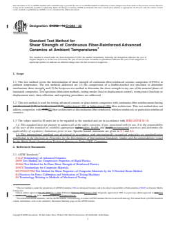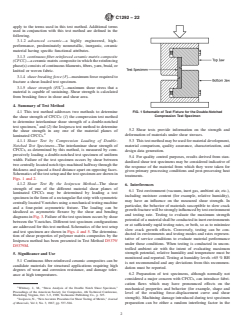 SIGNIFICANCE AND USE 5.1 Continuous fiber-reinforced ceramic composites can be candidate materials for structural applications requiring high degrees of wear and corrosion resistance, and damage tolerance at high temperatures. 5.2 Shear tests provide information on the strength and deformation of materials under shear stresses. 5.3 This test method may be used for material development, material comparison, quality assurance, characterization, and design data generation. 5.4 For quality control purposes, results derived from standardized shear test specimens may be considered indicative of the response of the material from which they were taken for given primary processing conditions and post-processing heat treatments. SCOPE 1.1 This test method covers the determination of shear strength of continuous fiber-reinforced ceramic composites (CFCCs) at ambient temperature. The test methods addressed are (1) the compression of a double-notched test specimen to determine interlaminar shear strength, and (2) the Iosipescu test method to determine the shear strength in any one of the material planes of laminated composites. Test specimen fabrication methods, testing modes (load or displacement control), testing rates (load rate or displacement rate), data collection, and reporting procedures are addressed. 1.2 This test method is used for testing advanced ceramic or glass matrix composites with continuous fiber reinforcement having unidirectional (1D) or bidirectional (2D) fiber architecture. This test method does not address composites with 3D fiber architecture or discontinuous fiber-reinforced, whisker-reinforced, or particulate-reinforced ceramics. 1.3 The values stated in SI units are to be regarded as the standard and are in accordance with IEEE/ASTM SI 10. 1.4 This standard does not purport to address all of the safety concerns, if any, associated with its use. It is the responsibility of the user of this standard to establish appropriate safety, health, and environmental practices and determine the applicability of regulatory limitations prior to use. Specific hazard statements are given in 8.1 and 8.2. 1.5 This international standard was developed in accordance with internationally recognized principles on standardization established in the Decision on Principles for the Development of International Standards, Guides and Recommendations issued by the World Trade Organization Technical Barriers to Trade (TBT) Committee.