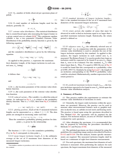 ABSTRACT This practice describes a methodology to statistically characterize the distribution of the largest indigenous non-metallic inclusions in steel specimens based upon quantitative metallographic measurements. This practice enables the experimenter to estimate the extreme value distribution of inclusions in steels. The procedures in determining non-metallic inclusions in steel are presented and discussed in details. SIGNIFICANCE AND USE 5.1 This practice is used to assess the indigenous inclusions or second-phase constituents in metals using extreme value statistics. 5.2 It is well known that failures of mechanical components, such as gears and bearings, are often caused by the presence of large nonmetallic oxide inclusions. Failure of a component can often be traced to the presence of a large inclusion. Predictions related to component fatigue life are not possible with the evaluations provided by standards such as Test Methods E45, Practice E1122, or Practice E1245. The use of extreme value statistics has been related to component life and inclusion size distributions by several different investigators (3-8). The purpose of this practice is to create a standardized method of performing this analysis. 5.3 This practice is not suitable for assessing the exogenous inclusions in steels and other metals because of the unpredictable nature of the distribution of exogenous inclusions. Other methods involving complete inspection such as ultrasonics must be used to locate their presence. SCOPE 1.1 This practice describes a methodology to statistically characterize the distribution of the largest indigenous nonmetallic inclusions in steel specimens based upon quantitative metallographic measurements. The practice is not suitable for assessing exogenous inclusions. 1.2 Based upon the statistical analysis, the nonmetallic content of different lots of steels can be compared. 1.3 This practice deals only with the recommended test methods and nothing in it should be construed as defining or establishing limits of acceptability. 1.4 The values stated in SI units are to be regarded as standard. No other units of measurement are included in this standard. 1.4.1 For measurements obtained from light microscopy, linear feature parameters shall be reported as micrometers, and feature areas shall be reported as micrometers. 1.5 The methodology can be extended to other materials and to other microstructural features. 1.6 This standard does not purport to address all of the safety concerns, if any, associated with its use. It is the responsibility of the user of this standard to establish appropriate safety, health, and environmental practices and determine the applicability of regulatory limitations prior to use. 1.7 This international standard was developed in accordance with internationally recognized principles on standardization established in the Decision on Principles for the Development of International Standards, Guides and Recommendations issued by the World Trade Organization Technical Barriers to Trade (TBT) Committee.