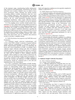 SIGNIFICANCE AND USE 4.1 Many contaminants, including chlorinated solvents and petroleum products, enter the subsurface in the form of an immiscible liquid, known as a NAPL. Understanding the potential emplacement and transport mechanism for NAPL in sediment is an important element of an overall conceptual site model (CSM) that forms a basis for (1) investigating the nature and extent of NAPL, (2) evaluating if (and how) human and ecological receptors may be exposed to NAPL, and (3) assessing remedial alternatives. In addition, demonstrating the potential movement of NAPL in sediments is hampered by the lack of standardized terminology and characterization protocols, thus necessitating this guide. 4.1.1 Understanding the presence and movement of NAPL in sediments is complicated by the lack of standardized protocols for characterizing NAPL movement in the diverse range of sediment environments. Literature searches have indicated that there is a limited body of available, applicable research. Current research has focused on site-specific sediment NAPL mobility assessment approaches, but application of common methods or decision-making processes identified across sites were limited. 4.1.2 The movement (or lack of movement) of NAPL in sediments is a key factor in developing protective remedial options for NAPL-impacted sediments and for the long-term management of sediment sites. Typical exposure pathways that are addressed through risk management decisions at upland sites are usually not applicable to sediment sites. Rather, “contaminants in the biologically active layer of the surface sediment at a site often drive exposure” (1)5, because in aquatic environments, benthic organisms live in the surface sediment to maintain access to oxygenated overlying water. NAPL that is present in subsurface sediment below the biologically active layer that is not migrating and has an overlying sediment that is expected to remain in place (that is, is not dredged or eroded) does not pose a risk to ... SCOPE 1.1 This guide provides considerations to inform sample collection, field screening, and sample handling of sediments impacted with non-aqueous phase liquid (NAPL) to assist in data collection for the evaluation of NAPL movement in sediment. The conditions affecting NAPL emplacement and movement in sediments are significantly different than in upland soils. As such, the framework for the assessment of NAPL movement in upland soils has been determined to have limited applicability for sediments. 1.2 This guide is applicable to sediment sites where the presence or suspected presence of NAPL has been identified. Sediments are the subject media considered in this guide, not surface water or groundwater. 1.3 The goal of this guide is to provide a technical framework for sample collection, field screening, and sample handling activities used to evaluate NAPL conditions, in particular NAPL movement (that is, mobility at the pore scale and migration at the NAPL body scale) in sediments, which can be used to inform the development and selection of remedial options and post-remedial monitoring activities. 1.4 This guide discusses sample collection procedures, including direct methods (that is, core and grab samples) and indirect methods (that is, DART®2, laser-induced florescence, and porewater samplers) for assessing NAPL presence or absence in sediment. 1.5 This guide discusses field characterization procedures for assessment of NAPL-impacted sediments including visual screening, stratification assessment, shake test, ultraviolet (UV) light test, NAPL FLUTe™3, and headspace vapor monitoring. 1.6 This guide discusses considerations to obtain samples representative of in situ conditions. This includes methods used to evaluate sediment integrity, sample retrieval from the sediment bed, core identification, sample storage onboard the vessel, sample retrieval from the coring device, sufficient sample recovery, core cut...