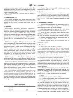 SIGNIFICANCE AND USE 5.1 Occasions exist where static charges on the vehicle must be dissipated by way of the tires. Electrical resistance inversely measures the tire's ability to dissipate static charge from the vehicle. SCOPE 1.1 This test method covers the measurement of the electrical resistance between the wheel of a mounted and inflated tire-wheel assembly and a flat conducting surface in loaded contact with the tire. 1.2 This test method specifies procedures and equipment such that electrical resistance can be accurately determined for tires with values up to 1012 Ω (ohms). 1.3 The values stated in SI units are to be regarded as the standard. The values given in parentheses are for information only. 1.4 This standard does not purport to address all of the safety concerns, if any, associated with its use. It is the responsibility of the user of this standard to establish appropriate safety, health, and environmental practices and determine the applicability of regulatory limitations prior to use. 1.5 This international standard was developed in accordance with internationally recognized principles on standardization established in the Decision on Principles for the Development of International Standards, Guides and Recommendations issued by the World Trade Organization Technical Barriers to Trade (TBT) Committee.