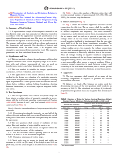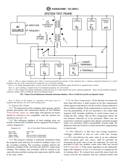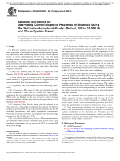 SIGNIFICANCE AND USE 4.1 This test method evaluates the performance of flat-rolled magnetic materials over a wide frequency range of ac excitation with and without incremental dc bias, as used on transformers, motors, and other laminated core devices. 4.2 This test method is suitable for design, specification acceptance, service evaluation, and research. 4.3 The application of test results obtained with this test method to the design or evaluation of a particular magnetic device must recognize the influence of the magnetic circuitry upon its performance. Some specific items to consider are size, shape, holes, welding, staking, bolting, bracketing, shorting between laminations, ac waveform, adjacent magnetic fields, and stress. SCOPE 1.1 This test method covers the determination of the magnetic properties of flat-rolled magnetic materials using Epstein test specimens with double-lap joints in the 25-cm Epstein frame. It covers determination of core loss, rms and peak exciting current, exciting power, magnetic field strength, and permeability. This test method is commonly used to test grain-oriented and nonoriented electrical steels but may also be used to test nickel-iron, cobalt-iron, and other flat-rolled magnetic materials. 1.2 This test method shall be used in conjunction with Practice A34/A34M and Test Method A343/A343M. 1.3 Tests under this test method may be conducted with either normal ac magnetization or with ac magnetization and superimposed dc bias (incremental magnetization). 1.4 In general, this test method has the following limitations: 1.4.1 Frequency—The range of this test method normally covers frequencies from 100 to 10 000 Hz. With proper equipment, the test method may be extended above 10 000 Hz. When tests are limited to the use of power sources having frequencies below 100 Hz, they shall use the procedures of Test Method A343/A343M. 1.4.2 Magnetic Flux Density (may also be referred to as Flux Density)—The range of magnetic flux density for this test method is governed by the test specimen properties and by the available instruments and other equipment components. Normally, for many materials, the magnetic flux density range is from 1 to 15 kG [0.1 to 1.5 T]. 1.4.3 Core Loss and Exciting Power—These measurements are normally limited to test conditions that do not cause a test specimen temperature rise in excess of 50°C or exceed 100 W/lb [220 W/kg]. 1.4.4 Excitation—Either rms or peak values of exciting current may be measured at any test point that does not exceed the equipment limitations provided that the impedance of the ammeter shunt is low and its insertion into the test circuit does not cause appreciably increased voltage waveform distortion at the test magnetic flux density. 1.4.5 Incremental Properties—Measurement of incremental properties shall be limited to combinations of ac and dc excitations that do not cause secondary voltage waveform distortion, as determined by the form factor method, to exceed a shift of 10 % away from sine wave conditions. 1.5 The values and equations stated in customary (cgs-emu and inch-pound) or SI units are to be regarded separately as standard. Within this standard, SI units are shown in brackets except for the sections concerning calculations where there are separate sections for the respective unit systems. The values stated in each system may not be exact equivalents; therefore, each system shall be used independently of the other. Combining values from the two systems may result in nonconformance with this standard. 1.6 This standard does not purport to address all of the safety concerns, if any, associated with its use. It is the responsibility of the user of this standard to establish appropriate safety, health, and environmental practices and determine the applicability of regulatory limitations prior to use. 1.7 This international standard was developed in accordance with internationally recognized princi...