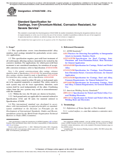 ASTM A744/A744M-21a is a technical specification published by ASTM International. Its full title is "Standard Specification for Castings, Iron-Chromium-Nickel, Corrosion Resistant, for Severe Service". This standard covers: ABSTRACT This specification covers standard requirements for iron-chromium-nickel alloy, stainless steel castings intended for particularly severe corrosive applications. Alloys shall be melted by the electric furnace process with or without refining such as argon-oxygen-decarburization. Castings shall be heat treated and shall conform to the required heat treatment conditions. The materials shall conform with the prescribed chemical requirements for carbon, manganese, silicon, phosphorus, sulfur, chromium, nickel, molybdenum, columbium, copper, selenium, tungsten, vanadium, iron, and nitrogen. SCOPE 1.1 This specification covers iron-chromium-nickel alloy stainless steel castings intended for particularly severe corrosive applications. 1.2 This specification requires post-weld heat treatment of all weld repairs affecting surfaces intended to be wetted by the corrosive medium. For applications for which post-weld heat treatment is not considered mandatory for retention of acceptable corrosion resistance, refer to Specification A743/A743M. Note 1: For general corrosion-resistant alloy castings, reference should be made to Specification A743/A743M. For general heat-resistant alloy castings, reference should be made to Specification A297/A297M. For nickel-base alloy castings, refer to Specification A494/A494M. 1.3 The values stated in either SI units or inch-pound units are to be regarded separately as standard. The values stated in each system may not be exact equivalents; therefore, each system shall be used independently of the other. Combining values from the two systems may result in nonconformance with the standard. 1.3.1 Within the text, the SI units are shown in brackets. 1.3.2 Inch-pound units are applicable for material ordered to Specification A744 and SI units for material ordered to Specification A744M. 1.4 This international standard was developed in accordance with internationally recognized principles on standardization established in the Decision on Principles for the Development of International Standards, Guides and Recommendations issued by the World Trade Organization Technical Barriers to Trade (TBT) Committee.