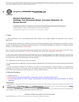 ABSTRACT This specification covers standard requirements for iron-chromium-nickel alloy, stainless steel castings intended for particularly severe corrosive applications. Alloys shall be melted by the electric furnace process with or without refining such as argon-oxygen-decarburization. Castings shall be heat treated and shall conform to the required heat treatment conditions. The materials shall conform with the prescribed chemical requirements for carbon, manganese, silicon, phosphorus, sulfur, chromium, nickel, molybdenum, columbium, copper, selenium, tungsten, vanadium, iron, and nitrogen. SCOPE 1.1 This specification covers iron-chromium-nickel alloy stainless steel castings intended for particularly severe corrosive applications. 1.2 This specification requires post-weld heat treatment of all weld repairs affecting surfaces intended to be wetted by the corrosive medium. For applications for which post-weld heat treatment is not considered mandatory for retention of acceptable corrosion resistance, refer to Specification A743/A743M. Note 1: For general corrosion-resistant alloy castings, reference should be made to Specification A743/A743M. For general heat-resistant alloy castings, reference should be made to Specification A297/A297M. For nickel-base alloy castings, refer to Specification A494/A494M. 1.3 The values stated in either SI units or inch-pound units are to be regarded separately as standard. The values stated in each system may not be exact equivalents; therefore, each system shall be used independently of the other. Combining values from the two systems may result in nonconformance with the standard. 1.3.1 Within the text, the SI units are shown in brackets. 1.3.2 Inch-pound units are applicable for material ordered to Specification A744 and SI units for material ordered to Specification A744M. 1.4 This international standard was developed in accordance with internationally recognized principles on standardization established in the Decision on Principles for the Development of International Standards, Guides and Recommendations issued by the World Trade Organization Technical Barriers to Trade (TBT) Committee.