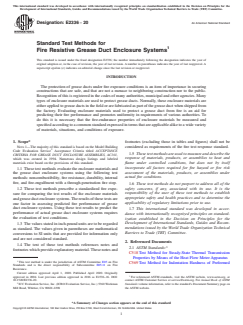 ASTM E2336-20 is a standard published by ASTM International. Its full title is "Standard Test Methods for Fire Resistive Grease Duct Enclosure Systems". This standard covers: SIGNIFICANCE AND USE 5.1 These test methods are intended to evaluate the ability of the grease duct enclosure system to do the following: 5.1.1 Resist the effects of a standardized fire exposure, 5.1.2 Retain its integrity, or 5.1.3 Exhibit both properties dependent upon the type of test assembly involved during a predetermined test exposure. 5.2 These test methods provide for the following measurements and evaluations where applicable: 5.2.1 Capability of the enclosure material to resist flaming (combustion) when exposed to 1382°F (750°C). 5.2.2 Loadbearing ability of the tested support system and fastening system to carry the load of the grease duct enclosure system during a standardized fire-engulfment test. 5.2.3 Ability of a fire stop to meet the requirements of Test Method E814 when used with a grease duct enclosure system. 5.2.4 Ability of the enclosure material to resist the passage of flames and hot gases during a standardized fire resistance test and a standardized internal fire test. 5.2.5 Transmission of heat through the grease duct and the enclosure material(s) during a standardized fire resistance test and a standardized internal fire test. 5.2.6 Ability of the grease duct enclosure system to resist the passage of water during a standardized hose stream test. 5.2.7 Comparative measurement of temperature aging of the enclosure material(s) when subjected to standardized cyclic thermal transmissions. 5.3 These test methods do not provide the following: 5.3.1 Full information as to performance of the enclosure material or the grease duct enclosure system constructed with components, densities, or dimensions other than those tested. 5.3.2 Evaluation of the degree by which the enclosure material or grease duct enclosure system contributes to the fire hazard by generation of smoke, toxic gases, or other products of combustion. 5.3.3 Measurement of the degree of control or limitation of the passage of smoke or products of combustion ... SCOPE Note 1: The majority of this standard is based on the Model Building Code Evaluation Service2 Acceptance Criteria titled ACCEPTANCE CRITERIA FOR GREASE DUCT ENCLOSURE ASSEMBLIES, AC101, which was created in 1994. Numerous design listings and labeled materials exist based on the provisions of this standard. 1.1 These test methods evaluate the enclosure materials and the grease duct enclosure systems using the following test methods: noncombustibility, fire resistance, durability, internal fire, and fire-engulfment with a through-penetration fire stop. 1.2 These test methods prescribe a standardized fire exposure for comparing the test results of the enclosure materials and grease duct enclosure systems. The results of these tests are one factor in assessing predicted fire performance of grease duct enclosure systems. Using these test results to predict the performance of actual grease duct enclosure systems requires the evaluation of test conditions. 1.3 The values stated in inch-pound units are to be regarded as standard. The values given in parentheses are mathematical conversions to SI units that are provided for information only and are not considered standard. 1.4 The text of these test methods references notes and footnotes which provide explanatory material. These notes and footnotes (excluding those in tables and figures) shall not be considered as requirements of the fire test response standard. 1.5 These test methods are used to measure and describe the response of materials, products, or assemblies to heat and flame under controlled conditions, but does not by itself incorporate all factors required for fire hazard or fire risk assessment of the materials, products, or assemblies under actual fire conditions. 1.6 These test methods do not purport to address all of the safety concerns, if any, associated with its use. It is the responsibility of the user of these test methods to establish appr...