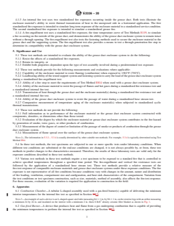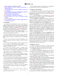 SIGNIFICANCE AND USE 5.1 These test methods are intended to evaluate the ability of the grease duct enclosure system to do the following: 5.1.1 Resist the effects of a standardized fire exposure, 5.1.2 Retain its integrity, or 5.1.3 Exhibit both properties dependent upon the type of test assembly involved during a predetermined test exposure. 5.2 These test methods provide for the following measurements and evaluations where applicable: 5.2.1 Capability of the enclosure material to resist flaming (combustion) when exposed to 1382°F (750°C). 5.2.2 Loadbearing ability of the tested support system and fastening system to carry the load of the grease duct enclosure system during a standardized fire-engulfment test. 5.2.3 Ability of a fire stop to meet the requirements of Test Method E814 when used with a grease duct enclosure system. 5.2.4 Ability of the enclosure material to resist the passage of flames and hot gases during a standardized fire resistance test and a standardized internal fire test. 5.2.5 Transmission of heat through the grease duct and the enclosure material(s) during a standardized fire resistance test and a standardized internal fire test. 5.2.6 Ability of the grease duct enclosure system to resist the passage of water during a standardized hose stream test. 5.2.7 Comparative measurement of temperature aging of the enclosure material(s) when subjected to standardized cyclic thermal transmissions. 5.3 These test methods do not provide the following: 5.3.1 Full information as to performance of the enclosure material or the grease duct enclosure system constructed with components, densities, or dimensions other than those tested. 5.3.2 Evaluation of the degree by which the enclosure material or grease duct enclosure system contributes to the fire hazard by generation of smoke, toxic gases, or other products of combustion. 5.3.3 Measurement of the degree of control or limitation of the passage of smoke or products of combustion ... SCOPE Note 1: The majority of this standard is based on the Model Building Code Evaluation Service2 Acceptance Criteria titled ACCEPTANCE CRITERIA FOR GREASE DUCT ENCLOSURE ASSEMBLIES, AC101, which was created in 1994. Numerous design listings and labeled materials exist based on the provisions of this standard. 1.1 These test methods evaluate the enclosure materials and the grease duct enclosure systems using the following test methods: noncombustibility, fire resistance, durability, internal fire, and fire-engulfment with a through-penetration fire stop. 1.2 These test methods prescribe a standardized fire exposure for comparing the test results of the enclosure materials and grease duct enclosure systems. The results of these tests are one factor in assessing predicted fire performance of grease duct enclosure systems. Using these test results to predict the performance of actual grease duct enclosure systems requires the evaluation of test conditions. 1.3 The values stated in inch-pound units are to be regarded as standard. The values given in parentheses are mathematical conversions to SI units that are provided for information only and are not considered standard. 1.4 The text of these test methods references notes and footnotes which provide explanatory material. These notes and footnotes (excluding those in tables and figures) shall not be considered as requirements of the fire test response standard. 1.5 These test methods are used to measure and describe the response of materials, products, or assemblies to heat and flame under controlled conditions, but does not by itself incorporate all factors required for fire hazard or fire risk assessment of the materials, products, or assemblies under actual fire conditions. 1.6 These test methods do not purport to address all of the safety concerns, if any, associated with its use. It is the responsibility of the user of these test methods to establish appr...