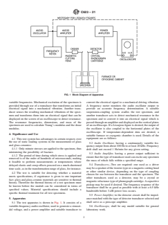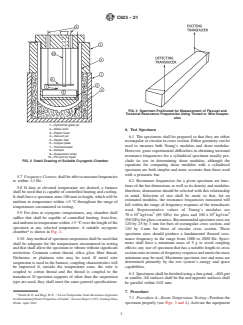 SIGNIFICANCE AND USE 4.1 This test system has advantages in certain respects over the use of static loading systems in the measurement of glass and glass-ceramics: 4.1.1 Only minute stresses are applied to the specimen, thus minimizing the possibility of fracture. 4.1.2 The period of time during which stress is applied and removed is of the order of hundreds of microseconds, making it feasible to perform measurements at temperatures where delayed elastic and creep effects proceed on a much-shortened time scale, as in the transformation range of glass, for instance. 4.2 The test is suitable for detecting whether a material meets specifications, if cognizance is given to one important fact: glass and glass-ceramic materials are sensitive to thermal history. Therefore the thermal history of a test specimen must be known before the moduli can be considered in terms of specified values. Material specifications should include a specific thermal treatment for all test specimens. SCOPE 1.1 This test method covers the determination of the elastic properties of glass and glass-ceramic materials. Specimens of these materials possess specific mechanical resonance frequencies which are defined by the elastic moduli, density, and geometry of the test specimen. Therefore the elastic properties of a material can be computed if the geometry, density, and mechanical resonance frequencies of a suitable test specimen of that material can be measured. Young's modulus is determined using the resonance frequency in the flexural mode of vibration. The shear modulus, or modulus of rigidity, is found using torsional resonance vibrations. Young's modulus and shear modulus are used to compute Poisson's ratio, the factor of lateral contraction. 1.2 All glass and glass-ceramic materials that are elastic, homogeneous, and isotropic may be tested by this test method.2 The test method is not satisfactory for specimens that have cracks or voids that represent inhomogeneities in the material; neither is it satisfactory when these materials cannot be prepared in a suitable geometry. Non-glass and glass-ceramic materials should reference Test Method E1875 for non-material specific methodology to determine resonance frequencies and elastic properties by sonic resonance. Note 1: Elastic here means that an application of stress within the elastic limit of that material making up the body being stressed will cause an instantaneous and uniform deformation, which will cease upon removal of the stress, with the body returning instantly to its original size and shape without an energy loss. Glass and glass-ceramic materials conform to this definition well enough that this test is meaningful. Note 2: Isotropic means that the elastic properties are the same in all directions in the material. Glass is isotropic and glass-ceramics are usually so on a macroscopic scale, because of random distribution and orientation of crystallites. 1.3 A cryogenic cabinet and high-temperature furnace are described for measuring the elastic moduli as a function of temperature from –195 to 1200 °C. 1.4 Modification of the test for use in quality control is possible. A range of acceptable resonance frequencies is determined for a piece with a particular geometry and density. Any specimen with a frequency response falling outside this frequency range is rejected. The actual modulus of each piece need not be determined as long as the limits of the selected frequency range are known to include the resonance frequency that the piece must possess if its geometry and density are within specified tolerances. 1.5 The values stated in SI units are to be regarded as standard. No other units of measurement are included in this standard. 1.6 This standard does not purport to address all of the safety concerns, if any, associated with its use. It is the responsibility of the user of this standard to establish appropriate safety, health, and environmental practices...
