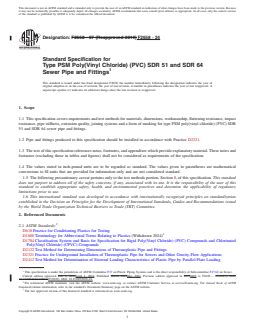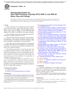ABSTRACT This specification covers requirements and test methods for materials, dimensions, workmanship, flattening resistance, impact resistance, pipe stiffness, extrusion quality, joining systems and a form of marking for type PSM poly(vinyl chloride) (PVC) SDR 51 and SDR 64 sewer pipe and fittings. In the solvent cement joint, the pipe spigot wedges into the tapered socket and the surfaces fuse together. Joints made with pipe and fittings shall show no signs of leakage when tested. The pipe dimensions, fitting dimensions, pipe flattening, impact resistance, pipe stiffness, joint tightness, and extrusion quality shall be tested to meet the requirements prescribed. SCOPE 1.1 This specification covers requirements and test methods for materials, dimensions, workmanship, flattening resistance, impact resistance, pipe stiffness, extrusion quality, joining systems and a form of marking for type PSM poly(vinyl chloride) (PVC) SDR 51 and SDR 64 sewer pipe and fittings. 1.2 Pipe and fittings produced to this specification should be installed in accordance with Practice D2321. 1.3 The text of this specification references notes, footnotes, and appendixes which provide explanatory material. These notes and footnotes (excluding those in tables and figures) shall not be considered as requirements of the specification. 1.4 The values stated in inch-pound units are to be regarded as standard. The values given in parentheses are mathematical conversions to SI units that are provided for information only and are not considered standard. 1.5 The following precautionary caveat pertains only to the test methods portion, Section 8, of this specification. This standard does not purport to address all of the safety concerns, if any, associated with its use. It is the responsibility of the user of this standard to establish appropriate safety, health, and environmental practices and determine the applicability of regulatory limitations prior to use. 1.6 This international standard was developed in accordance with internationally recognized principles on standardization established in the Decision on Principles for the Development of International Standards, Guides and Recommendations issued by the World Trade Organization Technical Barriers to Trade (TBT) Committee.