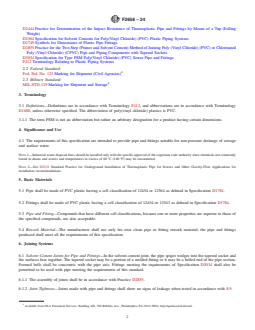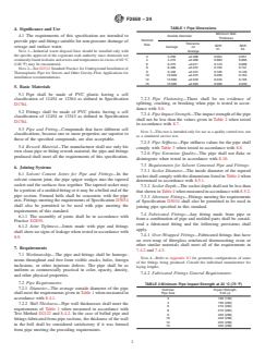 - Material Requirements: Specifies the grade of PVC plastic compounds to be used for both pipes (cell classification 12454 or 12364) and fittings (cell classification 12454 or 13343), according to referenced ASTM standards. Only clean rework material from the same manufacturer is permitted.