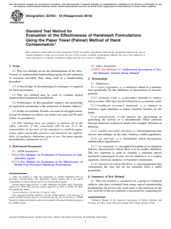 ASTM E2784-10(2015) is a standard published by ASTM International. Its full title is "Standard Test Method for Evaluation of the Effectiveness of Handwash Formulations Using the Paper Towel (Palmar) Method of Hand Contamination". This standard covers: SIGNIFICANCE AND USE 5.1 This procedure has been designed to evaluate handwash products using a palmar surface only contamination method. This method is an alternative contamination procedure to that listed in Test Method E1174. The current contamination procedure in Test Method E1174 describes a standardized procedure for contaminating the entire hand, palmar surface and back, directly using a marker organism. The contamination procedure in Test Method E1174 does not necessarily represent real world hand contamination. During routine activities it is only the palmar surface, comprising palms, fingers, and finger pads of the hands that becomes contaminated by contact with transient microorganisms. These microorganisms can then be transferred to food or objects. Methods to measure the amount of microorganisms transferred to food or objects can be found in Fischler et al5 and Fuls et al6 and will be developed into a future ASTM standard. SCOPE 1.1 This test method covers the determination of the effectiveness of antimicrobial handwashing agents for the reduction of transient microbial flora when used in a handwashing procedure. 1.2 A knowledge of microbiological techniques is required for these procedures. 1.3 This test method may be used to evaluate topical antimicrobial handwash formulations. 1.4 Performance of this procedure requires the knowledge of regulations pertaining to the protection of human subjects.2 1.5 In this test method, SI units are used for all applications, except for distance in which case inches are used and SI units follow in parentheses. 1.6 This standard does not purport to address all of the safety concerns, if any, associated with its use. It is the responsibility of the user of this standard to establish appropriate safety and health practices and determine the applicability of regulatory limitations prior to use. For more specific precautionary statements see 8.5.
