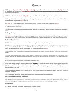 ABSTRACT This practice covers acceptable methods of fabricating and installing rigid pipe hangers used to support shipboard piping systems, it provides guidance for the design of hanger caps, straps and standoffs, selection of hanger and hanger liner materials, hanger bolting, and hanger spacing. The pipe hanger style includes: split cap hanger, 3strap hanger, welded hanger, U-bolt hanger, J band type hanger, Nelson hanger, clamp hanger assembled with mounting channel, poly-block twin clamp hanger, crimp-on weld stud-type hangers, banded weld stud-type hanger, and poly-block single-clamp hanger. Guidance in determining pipe hanger spacing are provided. Special consideration should be given to areas of concentrated loads, such as risers, valves, or groups of fittings, and to piping configurations that could create rotational forces. Hangers need not be lined unless the hanger and pipe are of dissimilar material. All hanger bolts within tanks or other inaccessible areas shall be secured with lock nuts, lock washers, or by some other means. Pipe hangers and standoffs located in areas subject to corrosion, such as in bilges, ballast tanks, and areas exposed to the weather, should be zinc-plated or blasted and coated with inorganic zinc or coated with the same material as that of the surrounding area. Standoffs fabricated from pipe should not be used within tanks. Consideration should be given to thermal growth of the piping when selecting or locating hangers so as not to overstress the piping or hangers. SCOPE 1.1 This practice covers acceptable methods of fabricating and installing rigid pipe hangers used to support shipboard piping systems with temperatures of 650 °F (343 °C) or less. 1.2 This practice provides guidance for the design of hanger caps, straps and standoffs, selection of hanger and hanger liner materials, hanger bolting, and hanger spacing. 1.3 Other hanger designs may be used provided they result in an adequately supported vibration-free piping system and are compatible with the intended system service and temperature limitations. 1.4 The values stated in inch-pound units are to be regarded as standard. The values given in parentheses are mathematical conversions to SI units that are provided for information only and are not considered standard. 1.5 This standard does not purport to address all of the safety concerns, if any, associated with its use. It is the responsibility of the user of this standard to establish appropriate safety, health, and environmental practices and determine the applicability of regulatory limitations prior to use. 1.6 This international standard was developed in accordance with internationally recognized principles on standardization established in the Decision on Principles for the Development of International Standards, Guides and Recommendations issued by the World Trade Organization Technical Barriers to Trade (TBT) Committee.