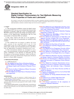 ASTM D8278-20: Standard Specification for Digital Contact Thermometers for Test Methods Measuring Flow Properties of Fuels and Lubricants defines criteria for digital contact thermometers (DCTs) intended for use in standardized testing methods to measure flow properties of fuels, lubricants, and related petroleum products. Developed by ASTM Committee D02, this standard provides comprehensive requirements to ensure that DCTs perform equivalently to traditional liquid-in-glass thermometers historically used in these applications. Emphasis is placed on SI units as the standard for all measurements, and compliance with internationally recognized calibration and competency requirements is integral to its application.