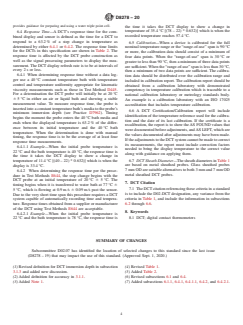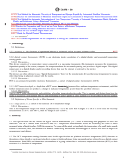 SCOPE 1.1 This specification establishes criteria for digital contact thermometers (DCT) for use in test methods that measure flow properties of materials within the scope of Committee D02. The DCT criteria are based on the design and sensing characteristics of the liquid-in-glass thermometers that are used successfully in Committee D02 test methods. 1.2 The values stated in SI units are to be regarded as standard. No other units of measurement are included in this standard. 1.3 This standard does not purport to address all of the safety concerns, if any, associated with its use. It is the responsibility of the user of this standard to establish appropriate safety, health, and environmental practices and determine the applicability of regulatory limitations prior to use. 1.4 This international standard was developed in accordance with internationally recognized principles on standardization established in the Decision on Principles for the Development of International Standards, Guides and Recommendations issued by the World Trade Organization Technical Barriers to Trade (TBT) Committee.