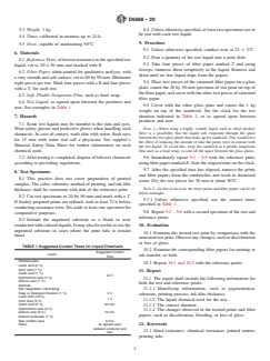 SIGNIFICANCE AND USE 4.1 Many types of printed matter, notably container labels, packaging materials, magazine and book covers, must be resistant to liquid materials that may contact them advertently or inadvertently. This practice permits an assessment of resistance of printed matter to several types of liquids. 4.2 The requirement that a reference print be run at the same time as the test print minimizes effects of atmospheric conditions (humidity and temperature) and other variations which may develop. 4.3 This practice can be used to determine whether new formulations are suitable for the end-use purpose and for specification acceptance between producer and user. SCOPE 1.1 This practice covers the evaluation of the relative resistance of printed matter to liquid chemicals, as evidenced by lack of discoloration, bleeding, or loss of gloss. 1.2 This practice utilizes a sandwich procedure similar in principle to ISO/TC 130 N 589. Spotting or immersion procedures are covered in Test Methods D1308, D1647, and D2248. 1.3 This practice is applicable to prints on any flat substrate including paper, paperboard, metallic foil, metal plate, and plastic films, and produced by any printing process including letterpress, offset lithography, flexography, gravure, silk screen, and non-impact. 1.4 The values stated in SI units are to be regarded as standard. No other units of measurement are included in this standard. 1.5 This standard does not purport to address all of the safety concerns, if any, associated with its use. It is the responsibility of the user of this standard to establish appropriate safety, health, and environmental practices and determine the applicability of regulatory limitations prior to use. For specific hazard statements, see Section 7. 1.6 This international standard was developed in accordance with internationally recognized principles on standardization established in the Decision on Principles for the Development of International Standards, Guides and Recommendations issued by the World Trade Organization Technical Barriers to Trade (TBT) Committee.