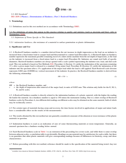 SIGNIFICANCE AND USE 4.1 A Rockwell hardness number is a number derived from the net increase in depth impression as the load on an indenter is increased from a fixed minor load to a major load and then returned to a minor load (Procedure A). A Rockwell alpha (α) hardness number represents the maximum possible remaining travel of a short-stroke machine from the net depth of impression, as the load on the indenter is increased from a fixed minor load to a major load (Procedure B). Indenters are round steel balls of specific diameters. Rockwell hardness numbers are always quoted with a scale symbol representing the indenter size, load, and dial scale used. This test method is based on Test Methods E18. Procedure A (Section 11) yields the indentation of the specimen remaining 15 s after a given major load is released to a standard 10-kg minor load. Procedure B (Section 12) yields the indentation of the indenter into the specimen after a 15-s application of the major load while the load is still applied. Each Rockwell scale division represents 0.002-mm (0.00008-in.) vertical movement of the indenter. In practice, the Rockwell hardness number is derived from the following relationship: where: HR = the Rockwell hardness number, and e = the depth of impression after removal of the major load, in units of 0.002 mm. This relation only holds for the E, M, L, R, and K scales. 4.2 A Rockwell hardness number is directly related to the indentation hardness of a plastic material, with the higher the reading the harder the material. An α hardness number is equal to 150 minus the instrument reading. Due to a short overlap of Rockwell hardness scales by Procedure A, two different dial readings on different scales may be obtained on the same material, both of which may be technically correct. 4.3 For certain types of materials having creep and recovery, the time factors involved in applications of major and minor loads have a considerable effect on the results of the measureme... SCOPE 1.1 This test method covers two procedures for testing the indention hardness of plastics and related plastic electrical insulating materials by means of the Rockwell hardness tester. 1.2 The values stated in SI units are to be regarded as standard. The values given in parentheses are for information only. 1.3 This standard does not purport to address all of the safety concerns, if any, associated with its use. It is the responsibility of the user of this standard to establish appropriate safety, health, and environmental practices and determine the applicability of regulatory limitations prior to use. Note 1: This test method and ISO 2039-2 are equivalent. Procedure A of this test method is equivalent to the test method in the main body of ISO 2039-2. Procedure B of this test method is equivalent to the test method in the integral annex part of ISO 2039-2. 1.4 This international standard was developed in accordance with internationally recognized principles on standardization established in the Decision on Principles for the Development of International Standards, Guides and Recommendations issued by the World Trade Organization Technical Barriers to Trade (TBT) Committee.