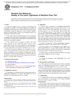 ASTM F511-17(2021): Standard Test Method for Quality of Cut (Joint Tightness) of Resilient Floor Tile establishes standardized procedures for evaluating the quality of cuts and joint tightness in resilient floor tile installations. Developed by ASTM International, this method ensures that the joints between square or rectangular resilient floor tiles are sufficiently tight to achieve a seamless, monolithic appearance. This standard is recognized internationally and adheres to the principles outlined by the World Trade Organization Technical Barriers to Trade (TBT) Committee. Tight and precise tile joints are crucial for satisfactory visual appeal in commercial, institutional, and residential flooring applications.
