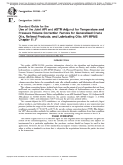 ASTM D1250-19e1 is the Standard Guide for the Use of the Joint API and ASTM Adjunct for Temperature and Pressure Volume Correction Factors (VCF) for Generalized Crude Oils, Refined Products, and Lubricating Oils, aligning with API MPMS Chapter 11.1. Developed by ASTM International, this guide provides essential information on algorithm and implementation procedures for correcting the temperature and pressure effects on density and volume of liquid hydrocarbons during measurement. The standard is globally recognized and supports accurate, standardized measurement practices in the petroleum and lubricants industries. It applies to both customary (U.S. customary units) and metric measurement systems.