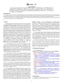 SIGNIFICANCE AND USE 5.1 The expanded limits of the Adjunct for VCF are defined in a mixture of terms of customary and metric units. Table 1 shows the defining limits and their associated units in bold italics. Also shown in Table 1 are the limits converted to their equivalent units (and, in the case of the densities, other base temperatures). 5.2 Note that only the precision levels of the defining values shown in Table 1 are correct. The other values showing converted units have been rounded to the significant digits shown; as rounded values, they may numerically fall just outside of the actual limits established by the defining values. 5.3 Table 2 provides a cross-reference between the historical table designations and the corresponding section in the Adjunct for VCF. Note that procedure paragraphs 11.1.6.3 (U.S. customary units) and 11.1.7.3 (metric units) provide methods for correcting on-line density measurements from live conditions to base conditions and then to compute CTPL factors for continuous volume corrections to base conditions. 5.4 When a glass hydrometer is used to measure the density of a liquid, special corrections must be made to account for the thermal expansion of the glass when the temperature is different from that at which the hydrometer was calibrated. The 1980 CTL Tables had generalized equations to correct glass hydrometer readings, and these corrections were part of the printed odd-numbered tables. However, detailed procedures to correct a glass hydrometer reading are beyond the scope of the Adjunct for VCF. The user should refer to the appropriate sections of API MPMS Chapter 9 or other appropriate density/hydrometer standards for guidance. 5.5 The set of correlations given in the Adjunct for VCF is intended for use with petroleum fluids comprising either crude oils, refined products, or lubricating oils that are single-phase liquids under normal operating conditions. The liquid classifications listed here are typical terms used in the industry, ... SCOPE 1.1 This guide provides information related to the algorithm and implementation procedure but does not contain the full set of algorithms. The algorithms, instructions, procedures, and examples are located in the associated supplementary adjuncts. The Adjunct for Volume Correction Factors (VCF) for temperature and pressure volume correction factors for generalized crude oils, refined products, and lubricating oils provides the algorithm and implementation procedure for the correction of temperature and pressure effects on density and volume of liquid hydrocarbons. Natural gas liquids (NGLs) and liquefied petroleum gases (LPGs) are excluded from consideration in this standard but may be found in API MPMS Chapter 11.2.4/GPA 8217 Temperature Correction for NGL and LPG. As this Adjunct for VCF will be applied to a variety of applications, the output parameters of CTL, Fp, CPL, and CTPL may be used as specified in other standards. 1.2 Including the pressure correction in the Adjunct for VCF represents an important change from the “temperature only” correction factors given in the 1980 Petroleum Measurement Tables. However, if the pressure is one atmosphere (the standard pressure), then there is no pressure correction and the standard/adjunct(s) will give CTL values consistent with the 1980 Petroleum Measurement Tables. 1.3 The Adjunct for VCF covers general procedures for the conversion of input data to generate CTL, Fp, CPL, and CTPL values at the user-specified base temperature and pressure (Tb, Pb). Two sets of procedures are included for computing volume correction factor: one set for data expressed in customary units (temperature in °F, pressure in psig); the other for the metric system of units (temperature in °C, pressure in kPa or bar). Note 1: In contrast to the 1980 Petroleum Measurement Tables, the metric procedures require the procedure for customary units be used first to compute density at 60 °F. This va...