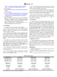 ASTM D1250-19e1 is a guide published by ASTM International. Its full title is "Standard Guide for the Use of the Joint API and ASTM Adjunct for Temperature and Pressure Volume Correction Factors for Generalized Crude Oils, Refined Products, and Lubricating Oils: API MPMS Chapter 11.1". This standard covers: SIGNIFICANCE AND USE 5.1 The expanded limits of the Adjunct for VCF are defined in a mixture of terms of customary and metric units. Table 1 shows the defining limits and their associated units in bold italics. Also shown in Table 1 are the limits converted to their equivalent units (and, in the case of the densities, other base temperatures). 5.2 Note that only the precision levels of the defining values shown in Table 1 are correct. The other values showing converted units have been rounded to the significant digits shown; as rounded values, they may numerically fall just outside of the actual limits established by the defining values. 5.3 Table 2 provides a cross-reference between the historical table designations and the corresponding section in the Adjunct for VCF. Note that procedure paragraphs 11.1.6.3 (U.S. customary units) and 11.1.7.3 (metric units) provide methods for correcting on-line density measurements from live conditions to base conditions and then to compute CTPL factors for continuous volume corrections to base conditions. 5.4 When a glass hydrometer is used to measure the density of a liquid, special corrections must be made to account for the thermal expansion of the glass when the temperature is different from that at which the hydrometer was calibrated. The 1980 CTL Tables had generalized equations to correct glass hydrometer readings, and these corrections were part of the printed odd-numbered tables. However, detailed procedures to correct a glass hydrometer reading are beyond the scope of the Adjunct for VCF. The user should refer to the appropriate sections of API MPMS Chapter 9 or other appropriate density/hydrometer standards for guidance. 5.5 The set of correlations given in the Adjunct for VCF is intended for use with petroleum fluids comprising either crude oils, refined products, or lubricating oils that are single-phase liquids under normal operating conditions. The liquid classifications listed here are typical terms used in the industry, ... SCOPE 1.1 This guide provides information related to the algorithm and implementation procedure but does not contain the full set of algorithms. The algorithms, instructions, procedures, and examples are located in the associated supplementary adjuncts. The Adjunct for Volume Correction Factors (VCF) for temperature and pressure volume correction factors for generalized crude oils, refined products, and lubricating oils provides the algorithm and implementation procedure for the correction of temperature and pressure effects on density and volume of liquid hydrocarbons. Natural gas liquids (NGLs) and liquefied petroleum gases (LPGs) are excluded from consideration in this standard but may be found in API MPMS Chapter 11.2.4/GPA 8217 Temperature Correction for NGL and LPG. As this Adjunct for VCF will be applied to a variety of applications, the output parameters of CTL, Fp, CPL, and CTPL may be used as specified in other standards. 1.2 Including the pressure correction in the Adjunct for VCF represents an important change from the “temperature only” correction factors given in the 1980 Petroleum Measurement Tables. However, if the pressure is one atmosphere (the standard pressure), then there is no pressure correction and the standard/adjunct(s) will give CTL values consistent with the 1980 Petroleum Measurement Tables. 1.3 The Adjunct for VCF covers general procedures for the conversion of input data to generate CTL, Fp, CPL, and CTPL values at the user-specified base temperature and pressure (Tb, Pb). Two sets of procedures are included for computing volume correction factor: one set for data expressed in customary units (temperature in °F, pressure in psig); the other for the metric system of units (temperature in °C, pressure in kPa or bar). Note 1: In contrast to the 1980 Petroleum Measurement Tables, the metric procedures require the procedure for customary units be used first to compute density at 60 °F. This va...