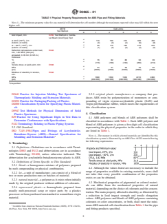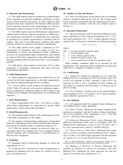ABSTRACT This specification covers materials made from only virgin ABS polymers and blends of ABS polymers suitable for use in the extrusion of pipe and molding of fittings. ABS polymers and blends of ABS polymers shall be classified according to cell limits: Cell 0; Cell 1; Cell 2; Cell 3; Cell 4; and Cell 5. The ABS material shall be produced by polymerization of the monomers, acrylonitrile, butadiene, and styrene, or their closely related chemical derivatives, or from a blend of ABS polymers from those monomers. The blend of ABS polymers can be intimately mixed by melt compounding, or it can be a homogeneous physical mixture of discrete ABS polymers. Materials shall be measured using techniques in accordance with the following test methods: impact testing; deflection temperature under load; tensile stress at yield point; modulus of elasticity in tension; and specific gravity. SCOPE 1.1 This classification system covers materials made from only virgin ABS polymers and blends of ABS polymers suitable for use in the extrusion of pipe and molding of fittings. 1.2 The requirements of this classification system are applicable only to the ABS polymers and blends of ABS polymers as classified and do not address the requirements of the finished pipe or fittings. The applicable ASTM standard specification for pipe or fittings shall be consulted for their requirements. 1.3 This classification system excludes ABS polymers and blends of ABS polymers made from reprocessed, regrind, reclaimed, or recycled materials. ABS rework, generated in-house by the original plastic manufacturer, is allowed to be used by that original manufacturer, provided the ABS product shipped meets the physical and mechanical properties required by its callout in Table 1. 1.4 This classification system and subsequent line callout (specification) provides a means for describing ABS materials used in the manufacture of pipe and fittings. It is not intended for the selection of materials. Material selection shall be made by those having expertise in the plastics field after careful consideration of the design and the performance required of the part, the environment to which it will be exposed, the fabrication process to be employed, the inherent properties of the material other than those covered by this classification system, and the economics. 1.5 This classification system and subsequent line callout (specification) provides for the classification of ABS polymers and blends of ABS polymers into groups based on five properties: Izod impact strength at room temperature, Izod impact strength at low temperature, deflection temperature under load, tensile stress at yield point, and modulus of elasticity in tension. The properties included are those required to identify the ABS material by the cell classifications. Note 1: Other requirements necessary to identify particular characteristics of ABS polymers and blends of ABS polymers will be added as test methods become available or the need is identified. Note 2: Due to pipe and fitting standards requirements a separate standard is planned for recycled materials. 1.6 The values stated in SI units are to be regarded as standard. The values given in parentheses are for information only. 1.7 The following safety hazards caveat pertains only to the test methods portion, Section 13, of this classification system: This standard does not purport to address all of the safety concerns, if any, associated with its use. It is the responsibility of the user of this standard to establish appropriate safety, health, and environmental practices and determine the applicability of regulatory limitations prior to use. Note 3: This standard and ISO 7245-1984 address the same subject matter, but differ in technical content. 1.8 This international standard was developed in accordance with internationally recognized principles on standardization established in the Decision on Principles for the De...