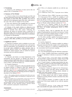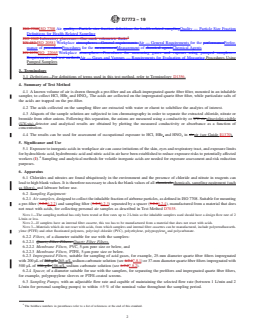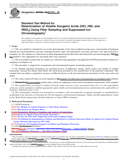 SIGNIFICANCE AND USE 5.1 Exposure to inorganic acids in workplace air can cause irritations of the skin, eyes and respiratory tract, and exposure limits for hydrochloric acid, hydrobromic acid and nitric acid in air have been established to reduce exposure risks to potentially affected workers (1).4 Sampling and analytical methods for volatile inorganic acids are needed for exposure assessment and risk reduction purposes. SCOPE 1.1 This test method is intended for use in the determination of the time-weighted average mass concentration of hydrogen chloride gas and hydrochloric acid mist, hydrogen bromide vapor and hydrobromic acid mist, and nitric acid vapor and mist in workplace air. The samples are collected on an alkali-impregnated quartz fiber filter and analyzed by ion chromatography. This test method is also appropriate for measuring short term exposures. 1.2 This test method assumes that air samples are collected using appropriate and applicable ASTM International standards for sampling of workplace air. 1.3 The procedure is targeted for occupational and environmental hygiene monitoring purposes. 1.4 No detailed operating instructions are provided because of differences among various makes and models of suitable instruments. Instead, the analyst shall follow the instructions provided by the manufacturer of the particular instrument. This standard does not address comparative accuracy of different devices or the precision between instruments of the same make and model. 1.5 The values stated in SI units are to be regarded as standard. No other units of measurement are included in this standard. 1.6 This test method contains notes, which are explanatory and not part of mandatory requirements of the standard. 1.7 This standard does not purport to address all of the safety concerns, if any, associated with its use. It is the responsibility of the user of this standard to establish appropriate safety, health, and environmental practices and determine the applicability of regulatory limitations prior to use. 1.8 This international standard was developed in accordance with internationally recognized principles on standardization established in the Decision on Principles for the Development of International Standards, Guides and Recommendations issued by the World Trade Organization Technical Barriers to Trade (TBT) Committee.