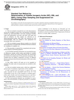 ASTM D7773-19 is a standard published by ASTM International. Its full title is "Standard Test Method for Determination of Volatile Inorganic Acids (HCl, HBr, and HNO<inf >3</inf>) Using Filter Sampling and Suppressed Ion Chromatography". This standard covers: SIGNIFICANCE AND USE 5.1 Exposure to inorganic acids in workplace air can cause irritations of the skin, eyes and respiratory tract, and exposure limits for hydrochloric acid, hydrobromic acid and nitric acid in air have been established to reduce exposure risks to potentially affected workers (1).4 Sampling and analytical methods for volatile inorganic acids are needed for exposure assessment and risk reduction purposes. SCOPE 1.1 This test method is intended for use in the determination of the time-weighted average mass concentration of hydrogen chloride gas and hydrochloric acid mist, hydrogen bromide vapor and hydrobromic acid mist, and nitric acid vapor and mist in workplace air. The samples are collected on an alkali-impregnated quartz fiber filter and analyzed by ion chromatography. This test method is also appropriate for measuring short term exposures. 1.2 This test method assumes that air samples are collected using appropriate and applicable ASTM International standards for sampling of workplace air. 1.3 The procedure is targeted for occupational and environmental hygiene monitoring purposes. 1.4 No detailed operating instructions are provided because of differences among various makes and models of suitable instruments. Instead, the analyst shall follow the instructions provided by the manufacturer of the particular instrument. This standard does not address comparative accuracy of different devices or the precision between instruments of the same make and model. 1.5 The values stated in SI units are to be regarded as standard. No other units of measurement are included in this standard. 1.6 This test method contains notes, which are explanatory and not part of mandatory requirements of the standard. 1.7 This standard does not purport to address all of the safety concerns, if any, associated with its use. It is the responsibility of the user of this standard to establish appropriate safety, health, and environmental practices and determine the applicability of regulatory limitations prior to use. 1.8 This international standard was developed in accordance with internationally recognized principles on standardization established in the Decision on Principles for the Development of International Standards, Guides and Recommendations issued by the World Trade Organization Technical Barriers to Trade (TBT) Committee.