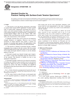 1.1 This practice covers the design, preparation, and testing of surface-crack tension (SCT) specimens. It relates specifically to testing under continuously increasing force and excludes cyclic and sustained loadings. The quantity determined is the residual strength of a specimen having a semielliptical or circular-segment fatigue crack in one surface. This value depends on the crack dimensions and the specimen thickness as well as the characteristics of the material.