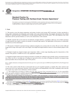 SIGNIFICANCE AND USE 4.1 The surface-crack tension (SCT) test is used to estimate the load-carrying capacity of simple sheet- or plate-like structural components having a type of flaw likely to occur in service. The test is also used for research purposes to investigate failure mechanisms of cracks under service conditions. 4.2 The residual strength of an SCT specimen is a function of the crack depth and length and the specimen thickness as well as the characteristics of the material. This relationship is extremely complex and cannot be completely described or characterized at present. 4.2.1 The results of the SCT test are suitable for direct application to design only when the service conditions exactly parallel the test conditions. Some methods for further analysis are suggested in Appendix X1. 4.3 In order that SCT test data can be comparable and reproducible and can be correlated among laboratories, it is essential that uniform SCT testing practices be established. 4.4 The specimen configuration, preparation, and instrumentation described in this practice are generally suitable for cyclic- or sustained-force testing as well. However, certain constraints are peculiar to each of these tests. These are beyond the scope of this practice but are discussed in Ref. (1). SCOPE 1.1 This practice covers the design, preparation, and testing of surface-crack tension (SCT) specimens. It relates specifically to testing under continuously increasing force and excludes cyclic and sustained loadings. The quantity determined is the residual strength of a specimen having a semielliptical or circular-segment fatigue crack in one surface. This value depends on the crack dimensions and the specimen thickness as well as the characteristics of the material. 1.2 Metallic materials that can be tested are not limited by strength, thickness, or toughness. However, tests of thick specimens of tough materials may require a tension test machine of extremely high capacity. The applicability of this practice to nonmetallic materials has not been determined. 1.3 This practice is limited to specimens having a uniform rectangular cross section in the test section. The test section width and length must be large with respect to the crack length. Crack depth and length should be chosen to suit the ultimate purpose of the test. 1.4 Residual strength may depend strongly upon temperature within a certain range depending upon the characteristics of the material. This practice is suitable for tests at any appropriate temperature. 1.5 Residual strength is believed to be relatively insensitive to loading rate within the range normally used in conventional tension tests. When very low or very high rates of loading are expected in service, the effect of loading rate should be investigated using special procedures that are beyond the scope of this practice. Note 1: Further information on background and need for this type of test is given in the report of ASTM Task Group E24.01.05 on Part-Through-Crack Testing (1).2 1.6 The values stated in either SI units or inch-pound units are to be regarded separately as standard. The values stated in each system may not be exact equivalents; therefore, each system shall be used independently of the other. Combining values from the two systems may result in non-conformance with the standard. 1.7 This standard does not purport to address all of the safety concerns, if any, associated with its use. It is the responsibility of the user of this standard to establish appropriate safety, health, and environmental practices and determine the applicability of regulatory limitations prior to use. 1.8 This international standard was developed in accordance with internationally recognized principles on standardization established in the Decision on Principles for the Development of International Standards, Guides and Recommendations issued by the World Trade Organization Technical Barriers to T...