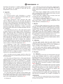 SIGNIFICANCE AND USE 5.1 It is often necessary to determine the depth of deep foundation elements supporting existing structures, such as buildings and bridges, for which neither drawings nor as-built records are available. Such situations occur when the foundation loads have to be increased or when it is intended to excavate near, or even under, the structure. When the top of the foundation is inaccessible, as is the case with underwater bridge piers, the Parallel Seismic method can be used to determine the deep foundations’ depth. The method is also applicable in cases where the foundation top can be reached, but the foundation element is not testable by the Low Strain Impact Integrity Testing Method (ASTM D5882) due to the foundation type (such as diaphragm and secant-pile walls, H-piles and sheet piles) or excessive foundation slenderness. 5.2 Agencies that meet the criteria of Practice D3740 are generally considered capable of competent and objective testing and inspection. However, users of this standard are cautioned that compliance with Practice D3740 does not in itself assure reliable results since the proper conduct and evaluation of parallel seismic tests requires training, special knowledge and experience. A suitably qualified engineer shall plan and supervise the acquisition of field data and the interpretation of the test results. SCOPE 1.1 The test Methods described in this standard are used to measure the depth of vertical deep foundation elements including micropiles, driven piles (prefabricated or cast in-situ), bored piles, secant or tangent pile walls, caissons, barrettes, diaphragm walls and sheet pile walls. It is applicable where the top of the said foundation element (in the following also named “pile”) cannot be exposed for testing and other testing methods such as ASTM D5882 or D6760 cannot be used. 1.2 This standard provides minimum requirements for measuring the depth of deep foundations. Plans, specifications, and/or provisions may provide additional requirements and methods as needed to satisfy the objectives of a particular test program. 1.3 This standard provides the following test methods: 1.3.1 Method “A” using a vertical access tube adjacent to the deep foundation. 1.3.2 Method “B” using a seismic cone inserted into the ground adjacent to the deep foundation. 1.4 Apparati and Methods herein designated “optional” may produce different a different kind of test results or additional information and may be used only when approved by the engineer responsible for the test. 1.5 The text of this standard references notes and footnotes that provide explanatory material. These notes and footnotes (excluding those in tables and figures) shall not be considered as requirements of the standard. 1.6 Units—The values stated in either SI units or inch-pound units are to be regarded separately as standard. The values stated in each system may not be exact equivalents; therefore, each system shall be used independently of the other. Combining values from the two systems may result in non-conformance with the standard. 1.7 All observed and calculated values shall conform to the guidelines for significant digits and rounding established in Practice D6026. 1.8 The methods used to specify how data are collected, recorded and calculated in this standard are regarded as the industry standard. In addition, they are representative of the significant digits that should generally be retained. The methods used do not consider material variation, purpose for obtaining the data, special-purpose studies or any considerations for the user’s objectives; and it is common practice to increase or reduce significant digits of reported data to be commensurate with these considerations. It is beyond the scope of this standard to consider significant digits used in analysis. 1.9 This standard offers an organized collection of information or a series of options and does not recommend a ...