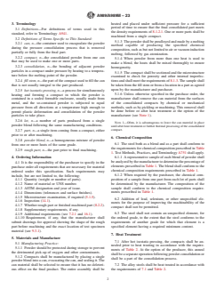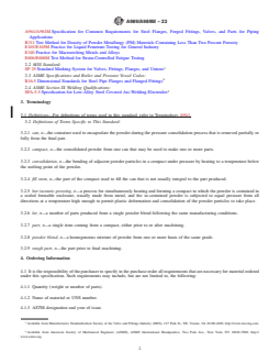 ABSTRACT This specification covers hot isostatically-pressed, powder metallurgy, alloy steel piping components such as flanges, fittings, valves, and similar parts for use in pressure systems and high-temperature services. Compacts shall be manufactured by placing a single powder blend into a can, evacuating the can, and sealing it. The entire assembly shall be heated and placed under sufficient pressure for a sufficient period of time to ensure that the final consolidated part meets the density requirements. The powder shall be prealloyed and made by a melting method such as vacuum induction melting followed by gas atomization. Alloy steels shall undergo annealing, liquid quenching, and tempering in accordance to heat treatment temperature and cooling media requirements. The steel both as a blend and as a part shall conform to the chemical composition requirements for carbon, manganese, phosphorus, sulfur, silicon, nickel, chromium, molybdenum, columbium, tantalum, and titanium. Density measurement, microstructural examination, and hydrostatic, tension, hardness, and fatigue tests shall be performed; wherein, the specimens shall conform to the specified structural integrity and mechanical property requirements such as porosity, microstructure, tensile strength, yield strength, elongation, reduction of area, and Brinell hardness. SCOPE 1.1 This specification covers hot isostatically-pressed, powder metallurgy, alloy steel piping components for use in pressure systems. Included are flanges, fittings, valves, and similar parts made to specified dimensions or to dimensional standards, such as in ASME Specification B16.5. 1.2 Several grades of alloy steels are included in this specification. 1.3 Supplementary requirements are provided for use when additional testing or inspection is desired. These shall apply only when specified individually by the purchaser in the order. 1.4 This specification is expressed in both inch-pound units and in SI units. Unless the order specifies the applicable “M” specification designation (SI units), however, the material shall be furnished to inch-pound units. 1.5 The values stated in either inch-pound units or SI units are to be regarded separately as the standard. Within the text, the SI units are shown in brackets. The values stated in each system are not exact equivalents; therefore, each system must be used independently of the other. Combining values from the two systems may result in nonconformance with the specification. 1.6 The following safety hazards caveat pertains only to test methods portions, 8.1, 8.2, and 9.5 – 9.7 of this specification: This standard does not purport to address all of the safety concerns, if any, associated with its use. It is the responsibility of the user of this standard to establish appropriate safety, health, and environmental practices and to determine the applicability of regulatory limitations prior to use. 1.7 This international standard was developed in accordance with internationally recognized principles on standardization established in the Decision on Principles for the Development of International Standards, Guides and Recommendations issued by the World Trade Organization Technical Barriers to Trade (TBT) Committee.