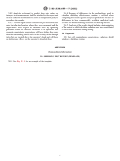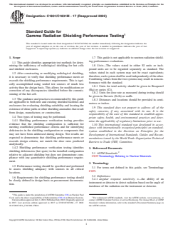 SIGNIFICANCE AND USE 5.1 Shielding performance testing should be performed to verify analytical predictions of shielding effectiveness, compliance with design requirements, and determine the location(s) of shielding deficiencies that may require either supplemental shielding, design modification, or changes to operating methods and procedures to resolve. 5.2 Dose rates higher than adjacent shielding may be expected in the vicinity of master-slave manipulator penetrations as a result of cable or tape clearance requirements within the mechanisms where they pass through the shield walls. This is true even with supplemental shielding installed in the manipulator through tube. 5.3 Similar to manipulator penetrations, when sources are placed directly in front of penetrations and gaps resulting from access doors or panels, radiation levels directly on the other side of the gaps or penetrations may be higher than levels in adjacent shielding or analytical predictions. If these test configurations are representative of how the shielded enclosure will actually be operated (that is, the test configuration is representative of engineered source and normally occupied work locations) than the additional expense of designing or modifying the shielded enclosure should be considered if that location is normally occupied and will result in a significant increase of dose rates to personnel. 5.4 Frames around shield windows may have a higher potential for shielding deficiencies. 5.5 Shield walls constructed of concrete may be subject to the formation of void spaces that could result in diminished shielding performance. 5.6 Background radiation levels in the area where the dose measurement data are being gathered shall be monitored and their contribution to measured dose rates accounted for in the data analysis as part of the test report. SCOPE 1.1 This guide identifies appropriate test methods for determining the sufficiency of radiological shielding for hot cells and shielded enclosures. 1.2 After constructing or modifying radiological shielding, it is necessary to verify that shielding performance meets or exceeds the shielding performance requirements. This is typically accomplished using sealed test sources of much less activity than the design basis. This allows for modifications or correction of any discrepancies identified before the commissioning of the hot cell. 1.3 The guidance and practices recommended by this guide are applicable to both new and existing shielded facilities and enclosures for evaluating shielding suitability and locating the existence of shine paths or other shielding anomalies that result from design, manufacture, or construction. 1.4 Two types of testing may be performed. 1.4.1 Shielding performance verification testing provides evidence that the shielding configuration is sufficient for meeting established performance criteria and for identifying deficiencies in the shielding configuration or components that may not have been addressed during design. Test results are expected to demonstrate that shielding performance meets or exceeds design criteria, not match the dose rates predicted analytically. 1.4.2 Shielding performance verification testing identifies shielding deficiencies (hot spots) in the installed configuration relative to adjacent shielding but does not demonstrate compliance with any quantitative shielding performance requirement. 1.5 Performance testing should be specified and performed to assess shielding adequacy with sources in all critical locations. 1.6 Requirements for shielding performance testing should be clearly defined in design basis or procurement documentation. 1.7 This guide is not applicable to neutron radiation shielding performance evaluations. 1.8 Units—The values stated in either SI units or inch-pound units are to be regarded separately as standard. The values stated in each system may not be exact equivalents; therefore, ea...