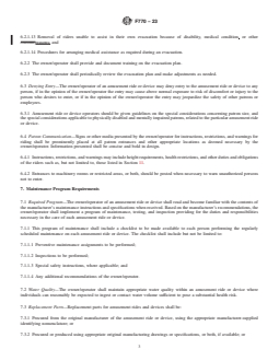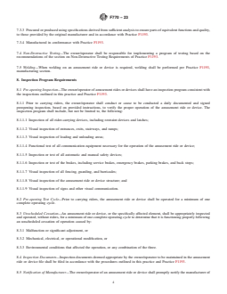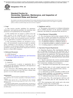 ASTM F770-23 is a standard published by ASTM International. Its full title is "Standard Practice for Ownership, Operation, Maintenance, and Inspection of Amusement Rides and Devices". This standard covers: SIGNIFICANCE AND USE 4.1 The purpose of this practice is to delineate information and to establish procedures for the operation, maintenance, inspection, and training for amusement rides and devices. SCOPE 1.1 This practice provides guidelines for operations, maintenance, and inspection procedures for amusement rides and devices to be performed by the owner/operator. 1.2 This standard does not purport to address all of the safety concerns, if any, associated with its use. It is the responsibility of the user of this standard to establish appropriate safety, health, and environmental practices and determine the applicability of regulatory limitations prior to use. 1.3 This international standard was developed in accordance with internationally recognized principles on standardization established in the Decision on Principles for the Development of International Standards, Guides and Recommendations issued by the World Trade Organization Technical Barriers to Trade (TBT) Committee.