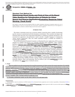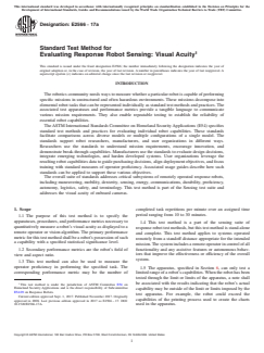 ASTM E2566-17a is a standard published by ASTM International. Its full title is "Standard Test Method for Evaluating Response Robot Sensing: Visual Acuity". This standard covers: SIGNIFICANCE AND USE 5.1 Various levels of visual acuity are essential when remotely operating robots in unstructured and often hazardous environments. Missions typically include establishing situational awareness, finding available paths, maneuvering through obstacles, identifying objects of interest, and performing detailed inspections. This test method measures robot system far-field and near-field visual acuity which are applicable to virtually every mission. These quantitative measures of performance provide a common language that allows robot users to better understand and express their own requirements and improve the way visual sensing capabilities are specified. 5.2 Multiple cameras could be incorporated into remotely operated robotic systems since a single camera is unlikely to be effective for all aspects of a mission. For example, cameras with zoom lenses are often used for far-field tasks. Cameras with close focus capabilities are often used for near-field tasks. Wide-angle lenses are often used for driving and obstacle avoidance. This test method characterizes each onboard camera to understand overall system capabilities. 5.3 This test method provides a way to unambiguously specify robot requirements in terms of the related measures of visual acuity and field of view. This helps quantify the trade-offs and general usefulness of optical versus digital zoom cameras and fixed versus variable focus lenses. The visual acuity charts can also help provide quantitative measures of performance within other test methods and training scenarios. See Figs. 2-4 for illustrations. FIG. 2 This Baseline Image is Used for Purposes of Comparisons Below FIG. 3 Three Images of the Same Scene with the Same Image Resolution. Top Row Shows Field of View Increasing from Left to Right (the image “zooms out”) While Bottom Row Shows Acuity Decreasing (features of the same size become harder to clearly observe) FIG. 4 Three Images of the Same Scene with the Same Field of View. The Top Row ... SCOPE 1.1 The purpose of this test method is to specify the apparatuses, procedures, and performance metrics necessary to quantitatively measure a robot’s visual acuity as displayed to a remote operator or vision algorithm. The primary performance metric for this test method shall be a robot’s possession of such a capability with a specified statistical significance level. 1.2 Secondary performance metrics are the robot’s field of view and aspect ratio. 1.3 This test method can also be used to measure the operator proficiency in performing the specified task. The corresponding performance metric may be the number of completed task repetitions per minute over an assigned time period ranging from 10 to 30 minutes. 1.4 This test method is a part of the sensing suite of response robot test methods, but this test method is stand-alone and complete. This test method applies to systems operated remotely from a standoff distance appropriate for the intended mission. The system includes a remote operator in control of all functionality and any assistive features or autonomous behaviors that improve the effectiveness or efficiency of the overall system. 1.5 The apparatus, specified in Section 6, can only test a limited range of a robot’s capabilities. When the robot has been tested through the limit or limits of the apparatus, a note shall be associated with the results indicating that the robot’s actual capability may be outside of the limit or limits imposed by the test apparatus. For example, the robot could exceed the capabilities of the printing process used to create the charts used in the apparatus. 1.6 Performing Location—This test method may be performed anywhere the specified apparatuses and environmental conditions can be implemented. 1.7 Units—The values stated in either SI units or inch-pound units are to be regarded separately as standard. The values stated in each system may not be exact equivalents; the...