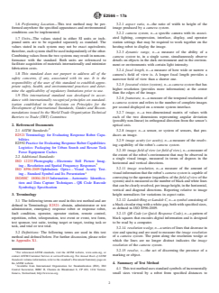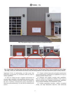 SIGNIFICANCE AND USE 5.1 Various levels of visual acuity are essential when remotely operating robots in unstructured and often hazardous environments. Missions typically include establishing situational awareness, finding available paths, maneuvering through obstacles, identifying objects of interest, and performing detailed inspections. This test method measures robot system far-field and near-field visual acuity which are applicable to virtually every mission. These quantitative measures of performance provide a common language that allows robot users to better understand and express their own requirements and improve the way visual sensing capabilities are specified. 5.2 Multiple cameras could be incorporated into remotely operated robotic systems since a single camera is unlikely to be effective for all aspects of a mission. For example, cameras with zoom lenses are often used for far-field tasks. Cameras with close focus capabilities are often used for near-field tasks. Wide-angle lenses are often used for driving and obstacle avoidance. This test method characterizes each onboard camera to understand overall system capabilities. 5.3 This test method provides a way to unambiguously specify robot requirements in terms of the related measures of visual acuity and field of view. This helps quantify the trade-offs and general usefulness of optical versus digital zoom cameras and fixed versus variable focus lenses. The visual acuity charts can also help provide quantitative measures of performance within other test methods and training scenarios. See Figs. 2-4 for illustrations. FIG. 2 This Baseline Image is Used for Purposes of Comparisons Below FIG. 3 Three Images of the Same Scene with the Same Image Resolution. Top Row Shows Field of View Increasing from Left to Right (the image “zooms out”) While Bottom Row Shows Acuity Decreasing (features of the same size become harder to clearly observe) FIG. 4 Three Images of the Same Scene with the Same Field of View. The Top Row ... SCOPE 1.1 The purpose of this test method is to specify the apparatuses, procedures, and performance metrics necessary to quantitatively measure a robot’s visual acuity as displayed to a remote operator or vision algorithm. The primary performance metric for this test method shall be a robot’s possession of such a capability with a specified statistical significance level. 1.2 Secondary performance metrics are the robot’s field of view and aspect ratio. 1.3 This test method can also be used to measure the operator proficiency in performing the specified task. The corresponding performance metric may be the number of completed task repetitions per minute over an assigned time period ranging from 10 to 30 minutes. 1.4 This test method is a part of the sensing suite of response robot test methods, but this test method is stand-alone and complete. This test method applies to systems operated remotely from a standoff distance appropriate for the intended mission. The system includes a remote operator in control of all functionality and any assistive features or autonomous behaviors that improve the effectiveness or efficiency of the overall system. 1.5 The apparatus, specified in Section 6, can only test a limited range of a robot’s capabilities. When the robot has been tested through the limit or limits of the apparatus, a note shall be associated with the results indicating that the robot’s actual capability may be outside of the limit or limits imposed by the test apparatus. For example, the robot could exceed the capabilities of the printing process used to create the charts used in the apparatus. 1.6 Performing Location—This test method may be performed anywhere the specified apparatuses and environmental conditions can be implemented. 1.7 Units—The values stated in either SI units or inch-pound units are to be regarded separately as standard. The values stated in each system may not be exact equivalents; the...