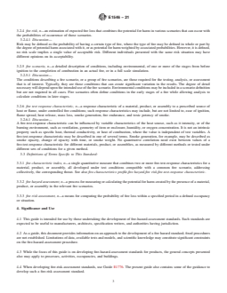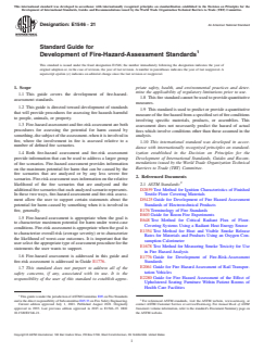 SIGNIFICANCE AND USE 4.1 This guide is intended for use by those undertaking the development of fire-hazard-assessment standards. Such standards are expected to be useful to manufacturers, architects, specification writers, and authorities having jurisdiction. 4.2 As a guide, this document provides information on an approach to the development of a fire hazard standard; fixed procedures are not established. Limitations of data, available tests and models, and scientific knowledge may constitute significant constraints on the fire-hazard-assessment procedure. 4.3 While the focus of this guide is on developing fire-hazard-assessment standards for products, the general concepts presented also may apply to processes, activities, occupancies, and buildings. 4.4 When developing fire-risk-assessment standards, use Guide E1776. The present guide also contains some of the guidance to develop such a fire-risk assessment standard. SCOPE 1.1 This guide covers the development of fire-hazard-assessment standards. 1.2 This guide is directed toward development of standards that will provide procedures for assessing fire hazards harmful to people, animals, or property. 1.3 Fire-hazard assessment and fire-risk assessment are both procedures for assessing the potential for harm caused by something–the subject of the assessment–when it is involved in fire, where the involvement in fire is assessed relative to a number of defined fire scenarios. 1.4 Both fire-hazard assessment and fire-risk assessment provide information that can be used to address a larger group of fire scenarios. Fire-hazard assessment provides information on the maximum potential for harm that can be caused by the fire scenarios that are analyzed or by any less severe fire scenarios. Fire-risk assessment uses information on the relative likelihood of the fire scenarios that are analyzed and the additional fire scenarios that each analyzed scenario represents. In these two ways, fire-hazard assessment and fire-risk assessment allow the user to support certain statements about the potential for harm caused by something when it is involved in fire, generally. 1.5 Fire-hazard assessment is appropriate when the goal is to characterize maximum potential for harm under worst-case conditions. Fire-risk assessment is appropriate when the goal is to characterize overall risk (average severity) or to characterize the likelihood of worst-case outcomes. It is important that the user select the appropriate type of assessment procedure for the statements the user wants to support. 1.6 Fire-hazard assessment is addressed in this guide and fire-risk assessment is addressed in Guide E1776. 1.7 This standard does not purport to address all of the safety concerns, if any, associated with its use. It is the responsibility of the user of this standard to establish appropriate safety, health, and environmental practices and determine the applicability of regulatory limitations prior to use. 1.8 This fire standard cannot be used to provide quantitative measures. 1.9 This standard is used to predict or provide a quantitative measure of the fire hazard from a specified set of fire conditions involving specific materials, products, or assemblies. This assessment does not necessarily predict the hazard of actual fires which involve conditions other than those assumed in the analysis. 1.10 This international standard was developed in accordance with internationally recognized principles on standardization established in the Decision on Principles for the Development of International Standards, Guides and Recommendations issued by the World Trade Organization Technical Barriers to Trade (TBT) Committee.