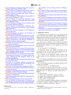 ASTM D653-22 is a standard published by ASTM International. Its full title is "Standard Terminology Relating to Soil, Rock, and Contained Fluids". This standard covers: SIGNIFICANCE AND USE 3.1 Definitions in this standard are to be regarded as the correct ones for terms found in other ASTM standards of Committee D18. Certain terms may be found in more than one standard issued under the jurisdiction of this committee and many of these terms have been placed in this standard. 3.2 Terms that are defined in some textbooks may differ slightly from those in this terminology standard. Definitions in this terminology standard are to be regarded as correct for ASTM usage. 3.3 See Appendix X1 for References. 3.4 Definitions marked with (ISRM) are included for the convenience of the user and were taken directly from the International Society for Rock Mechanics (see X1.3). 3.5 A number of the definitions include symbols. The symbols appear in italics immediately after the name of the term. 3.5.1 No significance should be placed on the order in which the symbols are presented where two or more are given for an individual term. 3.5.2 The symbols presented are examples; therefore, other symbols are acceptable. 3.5.3 See Appendix X2 for ISRM Symbols. 3.6 A number of definitions indicate the units of measurements in brackets and which follow the symbol(s) if given. The applicable units are indicated by italic capital letters, as follows: D—Dimensionless F—Force, such as pound-force, ton-force, newton L—Length, such as inch, foot, millimeter, and meter4 M—Mass, such as kilogram, gram T—Time, such as second, minute 3.6.1 Positive exponents designate multiples in the numerator. Negative exponents designate multiples in the denominator. Degrees of angle are indicated as “degrees.” 3.6.2 Expressing the units either in SI or the inch-pound system has been purposely omitted in order to leave the choice of the system and specific unit to the engineer and the particular application, for example: FL−2—may be expressed in pounds-force per square inch, kilopascals, tons per square foot, etc. LT−1—may be expressed in feet per minu... SCOPE 1.1 These definitions apply to many terms found in the Terminology section of standards of ASTM Committee D18. 1.2 This terminology standard defines terms related to soil, rock, and contained fluids found in the various sections of standards under the jurisdiction of ASTM Committee D18. 1.3 Definitions of terms relating to frozen soils are contained in Terminology D7099. 1.4 This international standard was developed in accordance with internationally recognized principles on standardization established in the Decision on Principles for the Development of International Standards, Guides and Recommendations issued by the World Trade Organization Technical Barriers to Trade (TBT) Committee.
