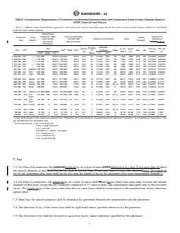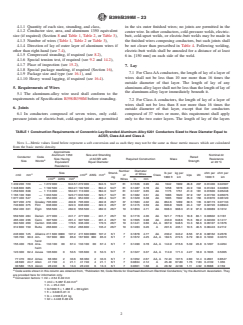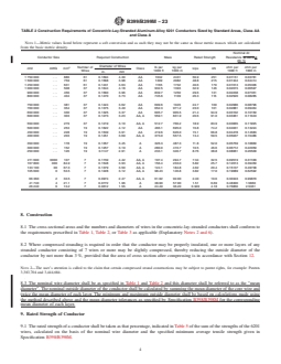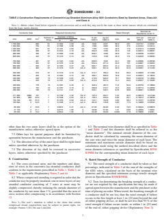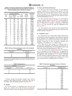 ABSTRACT This specification covers concentric-lay-stranded conductors, made from round aluminum-alloy 6201-T81 (hard: solution heat-treated, cold worked, and then artificially aged) wires, for use for electrical purposes. These conductors shall be constructed with a central core surrounded by one or more layers of helically laid wires. Conductors are classified as follows: Class AA (for bare conductors usually used in overhead lines) and Class A ( for conductors to be covered with weather resistant materials). The concentric-lay-stranded aluminum-alloy 6201 conductors sized to have diameter equal to ACSR, Class AA, and class A shall conform to the described construction requirements. The maximum electrical resistance of a unit length of stranded conductor shall not exceed the required nominal DC resistance. The concentric-lay-stranded aluminum-alloy 6201 conductors sized by standard areas, Class AA, and Class A shall conform to the described construction requirements. Minimum distance between joints in the complex and rating factors shall be described. SCOPE 1.1 This specification covers concentric-lay-stranded conductors, made from round aluminum-alloy 6201-T81 (hard: solution heat-treated, cold worked, and then artificially aged) wires or 6201-T83 (hard: higher conductivity, solution heat-treated, cold worked, and then artificially aged) wires, for use for electrical purposes. These conductors shall be constructed with a central core surrounded by one or more layers of helically laid wires (Explanatory Notes 1 and 2). Note 1: The aluminum alloy and temper designations conform to ANSI H35.1/H35.1[M]. Aluminum-alloy 6201 corresponds to Unified Numbering System alloy A96201 in accordance with Practice E527. 1.2 The values stated in inch-pound units or SI units are to be regarded separately as standard. The values in each system are not exact equivalents; therefore, each system shall be used independently of the other. Combining values from the two systems may result in nonconformance with the specification. 1.2.1 For density, resistivity and temperature, the values stated in SI units are to be regarded as standard. 1.3 This international standard was developed in accordance with internationally recognized principles on standardization established in the Decision on Principles for the Development of International Standards, Guides and Recommendations issued by the World Trade Organization Technical Barriers to Trade (TBT) Committee.