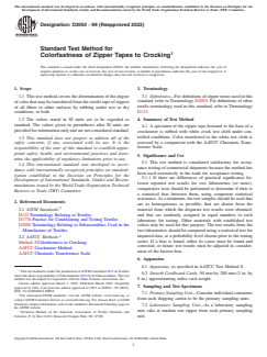 ASTM D2054-99(2022) - Standard Test Method for Colorfastness of Zipper Tapes to Crocking provides a reliable and widely-accepted procedure for determining the degree of color transfer from the textile tape of zippers to other surfaces by rubbing under either wet or dry conditions. This test method plays a key role in the textile and apparel industries by ensuring that zipper tapes retain their color integrity during use and do not stain adjacent materials. The standard is maintained by ASTM International, reflecting compliance with globally recognized standardization principles.