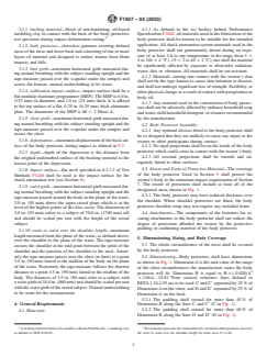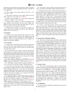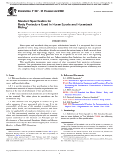 ASTM F1937-04(2023) is a technical specification published by ASTM International. Its full title is "Standard Specification for Body Protectors Used in Horse Sports and Horseback Riding". This standard covers: ABSTRACT This specification covers the design and minimum performance criteria, and associated test methods (including apparatuses required for) for body protectors used in horse sports and horseback riding. The body protectors shall meet specified requirements for the material used, protector assembly, extent and form of protective material, attachments, and dimension, sizing, and body coverage. The testing procedures that the body protectors shall go through are shock attenuation test, penetration and deformation test, impact sites test, padding separation test, and closure test. Prior to testing, each body protector should be conditioned in accordance to ambient temperature, low temperature, high temperature, and water immersion. SCOPE 1.1 This specification covers minimum performance criteria and describes test methods for body protectors for use in horse sports and horseback riding. 1.2 It is not the intention of this specification to bar from consideration materials of improved quality or performance not known at the time of development of this specification. 1.3 The values stated in inch-pound units are to be regarded as the standard. The values given in parentheses are for information only. 1.4 This standard does not purport to address all of the safety concerns, if any, associated with its use. It is the responsibility of the user of this standard to establish appropriate safety, health, and environmental practices and determine the applicability of regulatory limitations prior to use. 1.5 This international standard was developed in accordance with internationally recognized principles on standardization established in the Decision on Principles for the Development of International Standards, Guides and Recommendations issued by the World Trade Organization Technical Barriers to Trade (TBT) Committee.