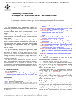 ASTM C1107/C1107M-20 is a technical specification published by ASTM International. Its full title is "Standard Specification for Packaged Dry, Hydraulic-Cement Grout (Nonshrink)". This standard covers: ABSTRACT This specification covers packaged dry, hydraulic cement grout (nonshrink) intended for use under applied load where a change in height below initial placement height is to be avoided. Grouts covered are composed of hydraulic cement, fine aggregate, and other ingredients. They require only the addition of mixing water for use. The materials used as ingredients in packaged, dry, grout include hydraulic cement, fine aggregate, and other ingredients. The performance requirements of the specimens are presented in details. Grout mixtures shall be produced using the conditions prescribed. For smaller quantities of grout, the mortar-mixing apparatus shall be as specified. Mixer for grout performance qualifications shall be clean, pre-wetted, and drained and essentially free of hardened mortar and other foreign material that can be removed with a trowel or by reasonably striking with a hammer. The procedures for preliminary adjustment mixing and grout performance qualification are presented in details. Consistency testing shall be performed on the grout mixture. Determine the yield of the grout using the 400-mL cylindrical measure described. SCOPE 1.1 This specification covers packaged dry, hydraulic cement grout (nonshrink) intended for use under applied load (such as to support a structure, a machine, and the like) where a change in height below initial placement height is to be avoided. 1.2 Grouts covered are composed of hydraulic cement and other ingredients. They require only the addition of mixing water for use. 1.3 The values stated in either SI units or inch-pound units are to be regarded separately as standard. The values stated in each system may not be exact equivalents; therefore, each system shall be used independently of the other. Combining values from the two systems may result in non-conformance with the standard. 1.4 The following safety hazards caveat pertains only to the test method portion of this specification: This standard does not purport to address all of the safety concerns, if any, associated with its use. It is the responsibility of the user of this standard to establish appropriate safety, health, and environmental practices and determine the applicability of regulatory limitations prior to use. 1.5 This international standard was developed in accordance with internationally recognized principles on standardization established in the Decision on Principles for the Development of International Standards, Guides and Recommendations issued by the World Trade Organization Technical Barriers to Trade (TBT) Committee.