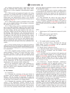 ABSTRACT This specification covers packaged dry, hydraulic cement grout (nonshrink) intended for use under applied load where a change in height below initial placement height is to be avoided. Grouts covered are composed of hydraulic cement, fine aggregate, and other ingredients. They require only the addition of mixing water for use. The materials used as ingredients in packaged, dry, grout include hydraulic cement, fine aggregate, and other ingredients. The performance requirements of the specimens are presented in details. Grout mixtures shall be produced using the conditions prescribed. For smaller quantities of grout, the mortar-mixing apparatus shall be as specified. Mixer for grout performance qualifications shall be clean, pre-wetted, and drained and essentially free of hardened mortar and other foreign material that can be removed with a trowel or by reasonably striking with a hammer. The procedures for preliminary adjustment mixing and grout performance qualification are presented in details. Consistency testing shall be performed on the grout mixture. Determine the yield of the grout using the 400-mL cylindrical measure described. SCOPE 1.1 This specification covers packaged dry, hydraulic cement grout (nonshrink) intended for use under applied load (such as to support a structure, a machine, and the like) where a change in height below initial placement height is to be avoided. 1.2 Grouts covered are composed of hydraulic cement and other ingredients. They require only the addition of mixing water for use. 1.3 The values stated in either SI units or inch-pound units are to be regarded separately as standard. The values stated in each system may not be exact equivalents; therefore, each system shall be used independently of the other. Combining values from the two systems may result in non-conformance with the standard. 1.4 The following safety hazards caveat pertains only to the test method portion of this specification: This standard does not purport to address all of the safety concerns, if any, associated with its use. It is the responsibility of the user of this standard to establish appropriate safety, health, and environmental practices and determine the applicability of regulatory limitations prior to use. 1.5 This international standard was developed in accordance with internationally recognized principles on standardization established in the Decision on Principles for the Development of International Standards, Guides and Recommendations issued by the World Trade Organization Technical Barriers to Trade (TBT) Committee.