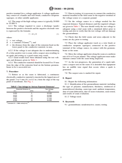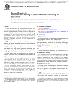 SIGNIFICANCE AND USE 5.1 Spark testing of geomembrane field seams is particularly useful in locations where other nondestructive test methods are not practical, for example in tight corners or a circumferential seam around a pipe. SCOPE 1.1 This practice covers the nondestructive testing of field seams in geomembranes using the spark test. A suspect area is indicated by the generation of a spark. The test is applicable to seams made by the extrusion method, seams made by using welding tape (a strip of the same type of material as the geomembrane, that is welded over adjacent sections of geomembrane to create a seam), or seams where it is practical to insert a conductive material in the seam just prior to or during fabrication. 1.2 The spark test may produce an electrical spark and therefore can only be used where an electrical spark would not create a hazard. 1.3 Unless the voltages and distances prescribed are carefully adhered to, a “false positive” indication may result. This false positive occurs when the arc distance is too large for the voltage applied at the time and conditions of testing. 1.4 The values stated in SI units are to be regarded as standard. The values given in parentheses are for information only. 1.5 This standard does not purport to address all of the safety concerns, if any, associated with its use. It is the responsibility of the user of this standard to establish appropriate safety, health, and environmental practices and determine the applicability of regulatory limitations prior to use. 1.6 This international standard was developed in accordance with internationally recognized principles on standardization established in the Decision on Principles for the Development of International Standards, Guides and Recommendations issued by the World Trade Organization Technical Barriers to Trade (TBT) Committee.