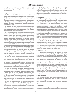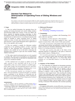 SIGNIFICANCE AND USE 5.1 This test method determines the operational forces of sliding windows and doors by simulating force applied by hand directly to movable sash or panels. Breakaway and in-motion operating forces are measures of the ease of operation of fenestration products. Product specifications, building codes, and building specifications establish operating force limits as measures of product performance or limits for handicapped accessibility, or both. 5.2 Window and door performance standards for air infiltration and water penetration in some cases require operating force measurements to be made and reported as an indication of the operability of the test specimen. 5.3 Operating forces can vary significantly from unit to unit due to factors such as installation parameters, wearing of sliding or rolling parts, lubrication, stiffening or softening of weather-strip, and environmental factors (for example, humidity, temperature, accumulation of dirt, and so forth). Therefore, when applied to new product designs, this test method requires that units be tested in a laboratory under controlled conditions including accurate mounting (plumb, square, and level) following the manufacturer's instructions. Use of this test method in the field does not necessarily indicate the operating forces that are inherent in the particular window design, but rather, provides a measurement of the forces required for operation of the particular unit at the particular time. The user is cautioned that installation defects such as bowed jambs, racked frames, or inadequate anchoring can result in binding or sticking of movable components and increased operating forces. 5.4 This test method requires measurement of both breakaway and in-motion operating forces. Generally, breakaway force is higher than in-motion operating force due to the difference between static and dynamic friction coefficients or the presence of weather-stripping and sash pockets, or both. Traditional fenestration product stand... SCOPE 1.1 This test method determines the operating forces for opening and closing horizontal and vertical sliding windows and horizontal sliding door systems. It does not address the forces required for opening pivoting, projecting, or other fenestration systems. This test method does not address the use or performance of add-on devices or mechanical operators that might be installed to reduce operating forces of sliding windows or doors. It deals only with the forces necessary to open and close a sash or panel through the direct application of force to the operable sash or panel. 1.2 This test method is suitable for laboratory product comparisons or for qualifying products, or both, as meeting window or door operating force specifications. This test method is also suitable for use in the field to determine the operating forces required to open and close installed sliding windows and doors. 1.3 The values stated in inch-pound units are to be regarded as standard. The values given in parentheses are mathematical conversions to SI units that are provided for information only and are not considered standard. 1.4 This standard does not purport to address all of the safety concerns, if any, associated with its use. It is the responsibility of the user of this standard to establish appropriate safety, health, and environmental practices and determine the applicability of regulatory limitations prior to use. For specific precautionary statements, see Section 7. 1.5 This international standard was developed in accordance with internationally recognized principles on standardization established in the Decision on Principles for the Development of International Standards, Guides and Recommendations issued by the World Trade Organization Technical Barriers to Trade (TBT) Committee.
