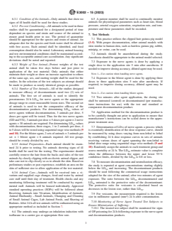 SIGNIFICANCE AND USE 4.1 This practice specifies an in-vivo measurement of CWA decontamination on the skin. 4.2 CWA skin decontaminants will have different modes of action including absorption, adsorption, removal, chemical neutralization or some combination of the above. There is, therefore, no single representative in-vitro method for validation of decontamination efficacy of products for skin decontamination. For example, measuring the presence of a radiolabelled chemical warfare agent after chemical neutralization, may give a false positive results. It has been shown that if the agent has been chemically neutralized, the radiolabel may still be present in a non-toxic molecule. In addition, some chemical neutralization methods may break down the original agent, but the breakdown product is highly toxic. In the case of VX, hydrolysis produces a highly toxic product, EA2192 (S-(2-diisopropylaminoethyl) methylphosphonothioic acid (8). 4.3 This standard practice is of significance in that efficacy is thoroughly evaluated to the extent possible to represent use on human skin. In-vivo studies have demonstrated that simple chemical monitoring for disappearance of the chemical agent may not be sufficient to measure decontamination and neutralization effectiveness. A standard practice is needed for determining actual decontamination and neutralization by measuring the decrease in mortality or lesion size caused by the agent. SCOPE 1.1 This practice establishes an in-vivo method for assessing the comparative efficacy of products used for the decontamination of chemical warfare agents (CWAs) on the skin. 1.2 This practice provides a quantitative efficacy comparison of different skin decontamination products. 1.3 To minimize the number of animals used, this in-vivo practice should be performed only after rigorous in-vitro studies of the candidate decontaminant, which can show the implied claims including chemical neutralization, decontamination studies on surfaces and appropriate testing such as cytotoxicity. 1.4 The values stated in SI units are to be regarded as standard. No other units of measurement are included in this standard. 1.5 This standard does not purport to address all of the safety concerns, if any, associated with the use of decontamination products or CWAs. It is the responsibility of the user of this standard to establish appropriate safety, health, and environmental practices and determine the applicability of regulatory limitations prior to use. 1.6 This international standard was developed in accordance with internationally recognized principles on standardization established in the Decision on Principles for the Development of International Standards, Guides and Recommendations issued by the World Trade Organization Technical Barriers to Trade (TBT) Committee.