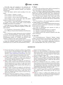 ASTM E3002-15(2023) is a standard published by ASTM International. Its full title is "Standard Practice for Assessing the Comparative Efficacy of Products Used for the Decontamination of Chemical Warfare Agents (CWAs) on Skin". This standard covers: SIGNIFICANCE AND USE 4.1 This practice specifies an in-vivo measurement of CWA decontamination on the skin. 4.2 CWA skin decontaminants will have different modes of action including absorption, adsorption, removal, chemical neutralization or some combination of the above. There is, therefore, no single representative in-vitro method for validation of decontamination efficacy of products for skin decontamination. For example, measuring the presence of a radiolabelled chemical warfare agent after chemical neutralization, may give a false positive results. It has been shown that if the agent has been chemically neutralized, the radiolabel may still be present in a non-toxic molecule. In addition, some chemical neutralization methods may break down the original agent, but the breakdown product is highly toxic. In the case of VX, hydrolysis produces a highly toxic product, EA2192 (S-(2-diisopropylaminoethyl) methylphosphonothioic acid (8). 4.3 This standard practice is of significance in that efficacy is thoroughly evaluated to the extent possible to represent use on human skin. In-vivo studies have demonstrated that simple chemical monitoring for disappearance of the chemical agent may not be sufficient to measure decontamination and neutralization effectiveness. A standard practice is needed for determining actual decontamination and neutralization by measuring the decrease in mortality or lesion size caused by the agent. SCOPE 1.1 This practice establishes an in-vivo method for assessing the comparative efficacy of products used for the decontamination of chemical warfare agents (CWAs) on the skin. 1.2 This practice provides a quantitative efficacy comparison of different skin decontamination products. 1.3 To minimize the number of animals used, this in-vivo practice should be performed only after rigorous in-vitro studies of the candidate decontaminant, which can show the implied claims including chemical neutralization, decontamination studies on surfaces and appropriate testing such as cytotoxicity. 1.4 The values stated in SI units are to be regarded as standard. No other units of measurement are included in this standard. 1.5 This standard does not purport to address all of the safety concerns, if any, associated with the use of decontamination products or CWAs. It is the responsibility of the user of this standard to establish appropriate safety, health, and environmental practices and determine the applicability of regulatory limitations prior to use. 1.6 This international standard was developed in accordance with internationally recognized principles on standardization established in the Decision on Principles for the Development of International Standards, Guides and Recommendations issued by the World Trade Organization Technical Barriers to Trade (TBT) Committee.