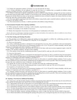 SIGNIFICANCE AND USE 4.1 U.S. Department of Justice standards for assessing the performance of ballistic-resistant torso body armor require conditioning of soft armor test items prior to ballistic testing. 4.2 This practice method may be applicable for certification testing or for research and development testing. 4.3 This practice has only been evaluated for ballistic-resistant body armor and has not been assessed for applicability to any other type of protective system. SCOPE 1.1 This practice applies only to the conditioning of soft body armor via temperature, humidity, and tumbling exposure prior to ballistic resistance testing. 1.2 This practice is intended for soft armor for law enforcement applications, and its purpose is to subject test items to conditions intended to provide some indication of the test item ability to withstand conditions of heat, moisture, and mechanical wear (folding and abrasion) that might be encountered during wear. 1.2.1 This practice is not intended for soft armor to be used in military applications. 1.3 In this practice, “other standards and specifications” and “unless specified elsewhere” refer to documents that require the use of this practice. Purchasers and other users are responsible for the “other standards and specifications” and for specifying any requirements that supersede those of this practice. 1.4 Units—The values stated in either SI units or inch-pound units are to be regarded separately as standard. The values stated in each system are not necessarily exact equivalents; therefore, to ensure conformance with the standard, each system shall be used independently of the other, and values from the two systems shall not be combined. 1.5 This standard does not purport to address all of the safety concerns, if any, associated with its use. It is the responsibility of the user of this standard to establish appropriate safety, health, and environmental practices and determine the applicability of regulatory limitations prior to use. 1.6 This international standard was developed in accordance with internationally recognized principles on standardization established in the Decision on Principles for the Development of International Standards, Guides and Recommendations issued by the World Trade Organization Technical Barriers to Trade (TBT) Committee.