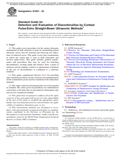 ASTM E1901-23 is a guide published by ASTM International. Its full title is "Standard Guide for Detection and Evaluation of Discontinuities by Contact Pulse-Echo Straight-Beam Ultrasonic Methods". This standard covers: SIGNIFICANCE AND USE 6.1 This guide provides procedures for the application of contact straight-beam examination for the detection and quantitative evaluation of discontinuities in materials. 6.2 Although not all requirements of this guide can be applied universally to all examinations, situations, and materials, it does provide basis for establishing contractual criteria between the users, and may be used as a general guide for preparing detailed specifications for a particular application. 6.3 This guide is directed towards the evaluation of discontinuities detectable with the beam normal to the entry surface. If discontinuities or other orientations are of concern, alternate scanning techniques are required. SCOPE 1.1 This guide covers procedures for the contact ultrasonic examination of bulk materials or parts by transmitting pulsed ultrasonic waves into the material and observing the indications of reflected waves. This guide covers only examinations in which one search unit is used as both transmitter and receiver (pulse-echo). This guide includes general requirements and procedures that may be used for detecting discontinuities, locating depth and distance from a point of reference and for making a relative or approximate evaluation of the size of discontinuities as compared to a reference standard. 1.2 This guide complements Practice E114 by providing more detailed procedures for the selection and standardization of the examination system and for evaluation of the indications obtained. 1.3 The values stated in inch-pound units are to be regarded as standard. The values given in parentheses are mathematical conversions to SI units that are provided for information only and are not considered standard. 1.4 This guide does not purport to address all of the safety concerns, if any, associated with its use. It is the responsibility of the user of this guide to establish the appropriate safety, health, and environmental practices and determine the applicability of regulatory limitations prior to use. 1.5 This international standard was developed in accordance with internationally recognized principles on standardization established in the Decision on Principles for the Development of International Standards, Guides and Recommendations issued by the World Trade Organization Technical Barriers to Trade (TBT) Committee.