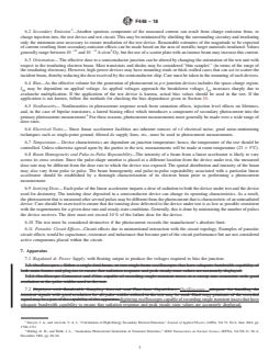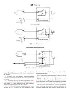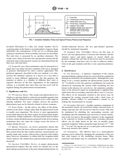 SIGNIFICANCE AND USE 5.1 PN Junction Diode—The steady-state photocurrent of a simple p-n junction diode is a directly measurable quantity that can be directly related to device response over a wide range of ionizing radiation. For more complex devices the junction photocurrent may not be directly related to device response. 5.2 Zener Diode—In this device, the effect of the photocurrent on the Zener voltage rather than the photocurrent itself is usually most important. The device is most appropriately tested while biased in the Zener region. In testing Zener diodes or precision voltage regulators, extra precaution must be taken to make certain the photocurrent generated in the device during irradiations does not cause the voltage across the device to change during the test. 5.3 Bipolar Transistor—As device geometries dictate that photocurrent from the base-collector junction be much greater than current from the base-emitter junction, measurements are usually made only on the collector-base junction with emitter open; however, sometimes, to obtain data for computer-aided circuit analysis, the emitter-base junction photocurrent is also measured. 5.4 Junction Field-Effect Device—A proper photocurrent measurement requires that the source be shorted (dc) to the drain during measurement of the gate-channel photocurrent. In tetrode-connected devices, the two gate-channel junctions should be monitored separately. 5.5 Insulated Gate Field-Effect Device—In this type of device, the true photocurrent is between the substrate and the channel, source, and drain regions. A current which can generate voltage that will turn on the device may be measured by the technique used here, but it is due to induced conductivity in the gate insulator and thus is not a junction photocurrent. SCOPE 1.1 This test method covers the measurement of steady-state primary photocurrent, Ipp, generated in semiconductor devices when these devices are exposed to ionizing radiation. These procedures are intended for the measurement of photocurrents greater than 10−9 A·s/Gy(Si or Ge), in cases for which the relaxation time of the device being measured is less than 25 % of the pulse width of the ionizing source. The validity of these procedures for ionizing dose rates as great as 108Gy(Si or Ge)/s has been established. The procedures may be used for measurements at dose rates as great as 1010Gy(Si or Ge)/s; however, extra care must be taken. Above 108Gy/s, the package response may dominate the device response for any device. Additional precautions are also required when measuring photocurrents of 10−9 A·s/Gy(Si or Ge) or lower. 1.2 Setup, calibration, and test circuit evaluation procedures are also included in this test method. 1.3 Because of the variability between device types and in the requirements of different applications, the dose rate range over which any specific test is to be conducted is not given in this test method but must be specified separately. 1.4 The values stated in SI units are to be regarded as standard. No other units of measurement are included in this standard. 1.5 This standard does not purport to address all of the safety concerns, if any, associated with its use. It is the responsibility of the user of this standard to establish appropriate safety, health, and environmental practices and determine the applicability of regulatory limitations prior to use. 1.6 This international standard was developed in accordance with internationally recognized principles on standardization established in the Decision on Principles for the Development of International Standards, Guides and Recommendations issued by the World Trade Organization Technical Barriers to Trade (TBT) Committee.