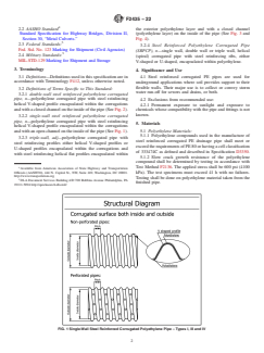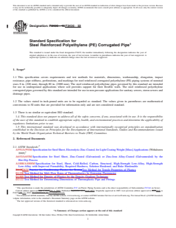 ASTM F2435-22 is a technical specification published by ASTM International. Its full title is "Standard Specification for Steel Reinforced Polyethylene (PE) Corrugated Pipe". This standard covers: ABSTRACT This specification covers requirements and test methods for materials, dimensions, workmanship, elongation, impact resistance, pipe stiffness, perforations, and markings for steel reinforced corrugated polyethylene (PE) piping systems. The steel reinforced polyethylene pipes governed by this standard are intended for use in underground applications where soil provides support for their flexible walls. These pipes will be used to collect or convey storm-water runoff for storm sewers and drainage pipes, or both. The following tests shall be performed: pipe dimensions and tolerances; perforations; pipe stiffness; steel to the polyethylene bonding; and joint tightness. SIGNIFICANCE AND USE 4.1 Steel reinforced corrugated PE pipes are used for underground applications where soil provides support to their flexible walls. Their major use is to collect or convey storm water run-off for sewers and drains, or both. 4.2 Exclusions from recommended use: 4.2.1 Permanent exposure to sunlight and exposure to chemicals whose compatibility with the pipe and fittings is not known. SCOPE 1.1 This specification covers requirements and test methods for materials, dimensions, workmanship, elongation, impact resistance, pipe stiffness, perforations, and markings for steel reinforced corrugated polyethylene (PE) piping systems of nominal sizes 8 in. (200 mm), through 80 in. (2000 mm). The steel reinforced polyethylene pipes governed by this standard are intended for use in underground applications where soil provides support for their flexible walls. The steel reinforced polyethylene corrugated pipes governed by this standard are intended for use in non-pressure applications for sanitary sewers, storm sewers and drainage pipes. 1.2 The values stated in inch-pound units are to be regarded as standard. The values given in parentheses are mathematical conversions to SI units that are provided for information only and are not considered standard. 1.3 There is no similar or equivalent ISO standard. 1.4 This standard does not purport to address all of the safety concerns, if any, associated with its use. It is the responsibility of the user of this standard to establish appropriate safety, health, and environmental practices and determine the applicability of regulatory limitations prior to use. 1.5 This international standard was developed in accordance with internationally recognized principles on standardization established in the Decision on Principles for the Development of International Standards, Guides and Recommendations issued by the World Trade Organization Technical Barriers to Trade (TBT) Committee.